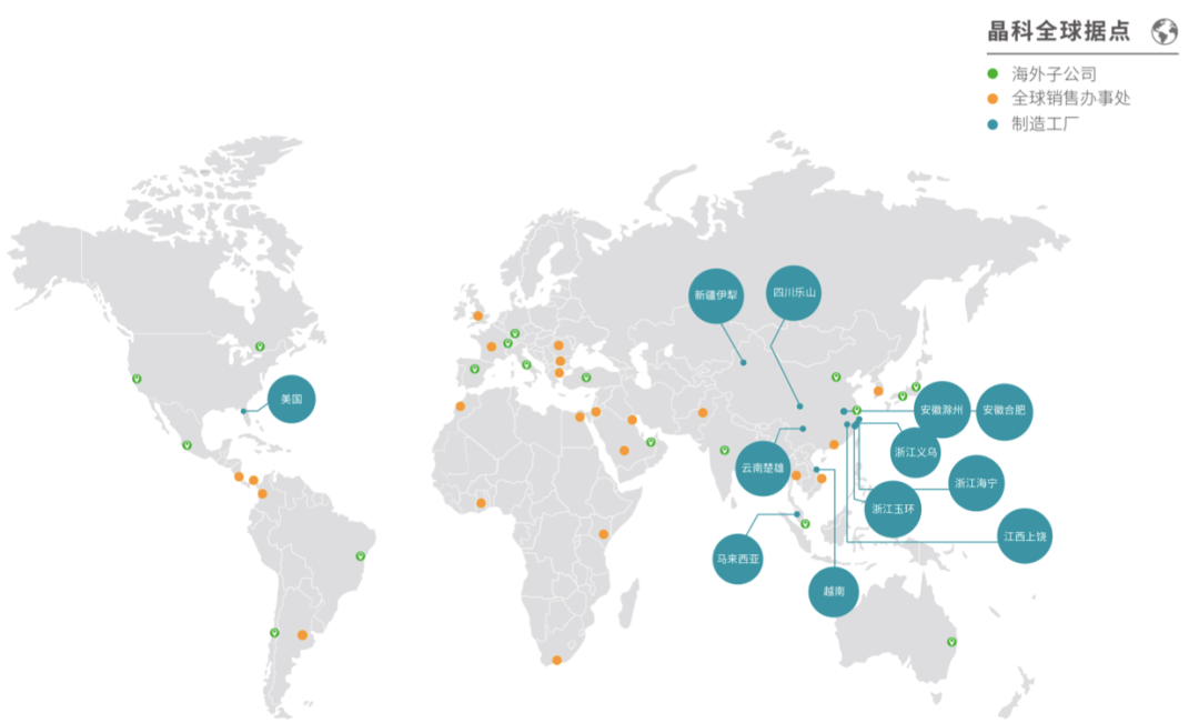 晶科能源是一家太阳能科技企业,聚焦光伏产品一体化研发制造和清洁能源整体解决方案提供。信息显示,晶科能源的产品服务于全球160余个国家和地区的3000余家客户,多年位列全球组件出货量冠军。晶科能源在行业中率先建立了从硅料加工到硅片、电池片和组件生产的“垂直一体化”产能,在中国、马来西亚、越南、美国共拥有14个全球化生产基地。2022年一季度,公司成为全球首个组件出货量累计超过100GW的光伏企业。