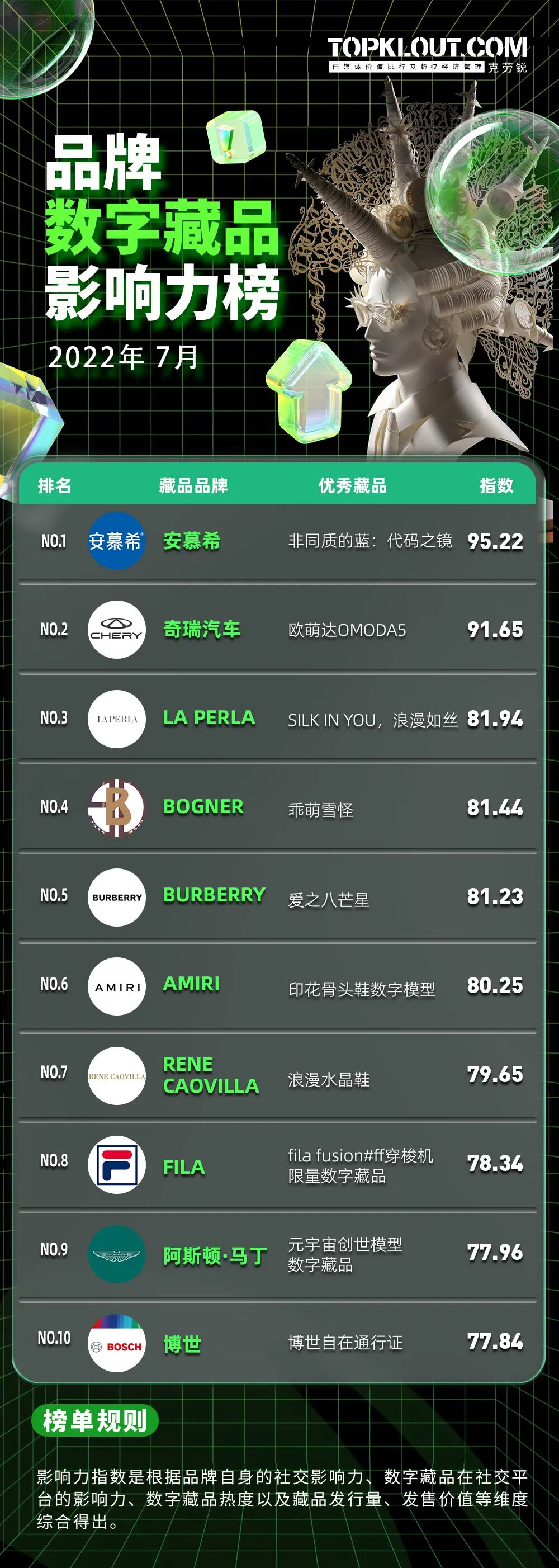 最新文章2024-02-02 7月《品牌数字藏品影响力榜》发布,洞察数字藏品掀起的营销新风暴 以下文章来源于元宇宙雷达 本文转载自元宇宙雷达。文章所述观点不代表新榜立场,转载请联系原作者。 2022年,元宇宙概念蓬勃发展,逐渐与各领域内容碰撞出火花,社交媒体作为元宇宙与现实世界的连接渠道,也为内容、品牌影响力的发酵提供了合适的环境。 为了帮助市场科学评价品牌数字藏品的社交影响力和营销价值,同时为行业提供品牌数字藏品的评估与洞察,元宇宙雷达发布《品牌数字藏品影响力榜》,以第三方视角提供营销、策略方向的分析与支持,探索品牌借势虚拟藏品的发展空间。 榜单从数字藏品的社交影响力、品牌社交影响力、数字藏品稀有度、数字藏品总价值、发布平台影响力五大维度出发,评价的对象是消费品牌以市场营销活动或元宇宙营销发布的数字藏品,暂不包含艺术机构、博物馆等发布的艺术类数字藏品。 同时,榜单评价的数字藏品发布平台主要包括独立的数字藏品应用或在独立交易平台内的数字藏品相关频道、模块、小程序等市场可流通渠道,不包含品牌自有发布渠道或品牌自有小程序等私域渠道。 7月《品牌数字藏品影响力榜》中,安慕希《非同质的蓝·代码之镜》、奇瑞汽车《欧萌达OMODA5》、LA PERLA《SILK IN YOU,浪漫如丝》荣登TOP3,展现出数字藏品本身与品牌突出的社交影响力与价值。 下面我们来看一下完整榜单吧! 中国知名AI和加密艺术家宋婷于白族扎染非遗传人张翔学习扎染,并打造了安慕希首款动态数字艺术藏品《非同质的蓝:代码之镜》系列,并于2022年7月29日在TopHolder头号藏家微博小程序限量发行999枚。(了解更多点击⬇️图片查看) 本文来自微信公众号“头号藏家”(ID:topholder01)。大作社经授权转载,该文观点仅代表作者本人,大作社平台仅提供信息存储空间服务。 TAGS: 发布品牌宇宙数字藏品 相关文章英赫日报 | 李宁 × 空…米兰时装周的异星来客,用结…米兰“MoLo”移动与物流…西班牙艺术家 Juan d…把小鸟画成美少女,她弃医从…这些鸡蛋包装不只是有趣,设…国产文具又炸了!晨光再造“…七点资讯 |《更衣人偶坠入…AlphaDraw筑绘通「…秦始皇的黑,是你不懂的黑。