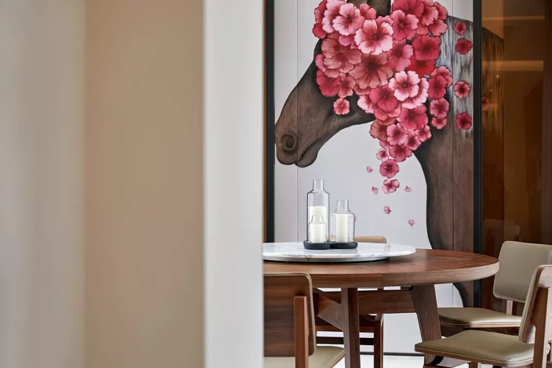 空间总是“关系”的连接体,无关乎建筑还是装饰,是明暗,是色彩亦或是人与自然。一直强调私宅空间的存在是为了提高生活品质,自然人与环境的关系是此次设计的唯一核心。设计中没有将区域与区域做明显的划分,正因如此空间便多了一份家的灵动与随意。喜欢光,无关乎是天光还是灯光,它如同“白色”般“无”,但又充满力量与钢需,于是便有了空间中光与白墙的相得益彰。喜欢线,无关乎曲线还是直线,它是分割又是连接,我想不出还有什么比一张白纸上画上的线条更让人心悦。大面积的墙体留白与鲜色的绘画对比,述说着关于现代东方美学的生活仪式。有意识的将庭院与室内做了无界线的连接,地面是,地下空间亦是,“我想有个院子,它在我房间里”这是我很向往的生活,所幸在此项目中得到实现。
