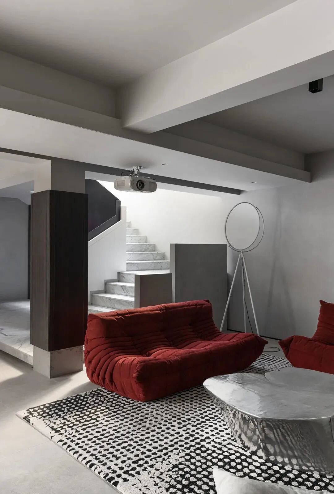 整个地下室,设计师打造了一个灰色空间,舒适时尚。Superloon落地灯,是Jasper Morrison 为 FLOS 设计的,灵感来自于太空和月球,灯光如同月亮一样。通过灯架上的调光旋钮调节亮度,如同月亮般阴晴圆缺。