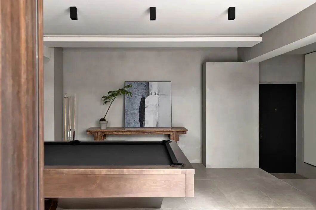 木质条案带着一种侘寂美,「侘」在日语中的意思是「简陋安静中融入质朴的美」,「寂」则包含「人性中的寂寞感、时间易逝和万物无常」,设计师希望整个空间呈现出朴素和本真,为主人留下生活中最值得珍惜的体验,也提醒着主人品味当下。