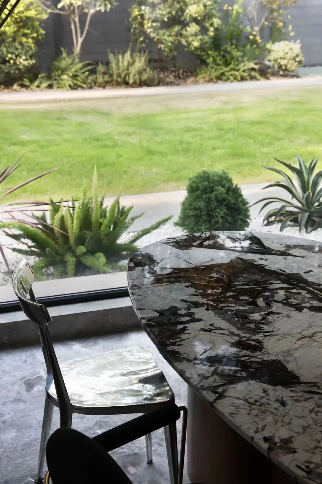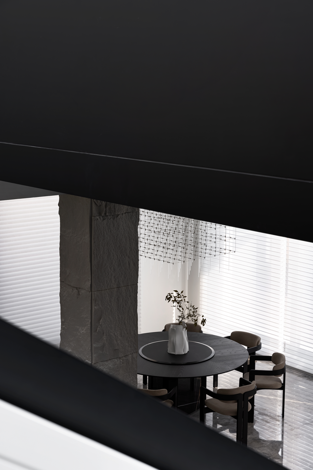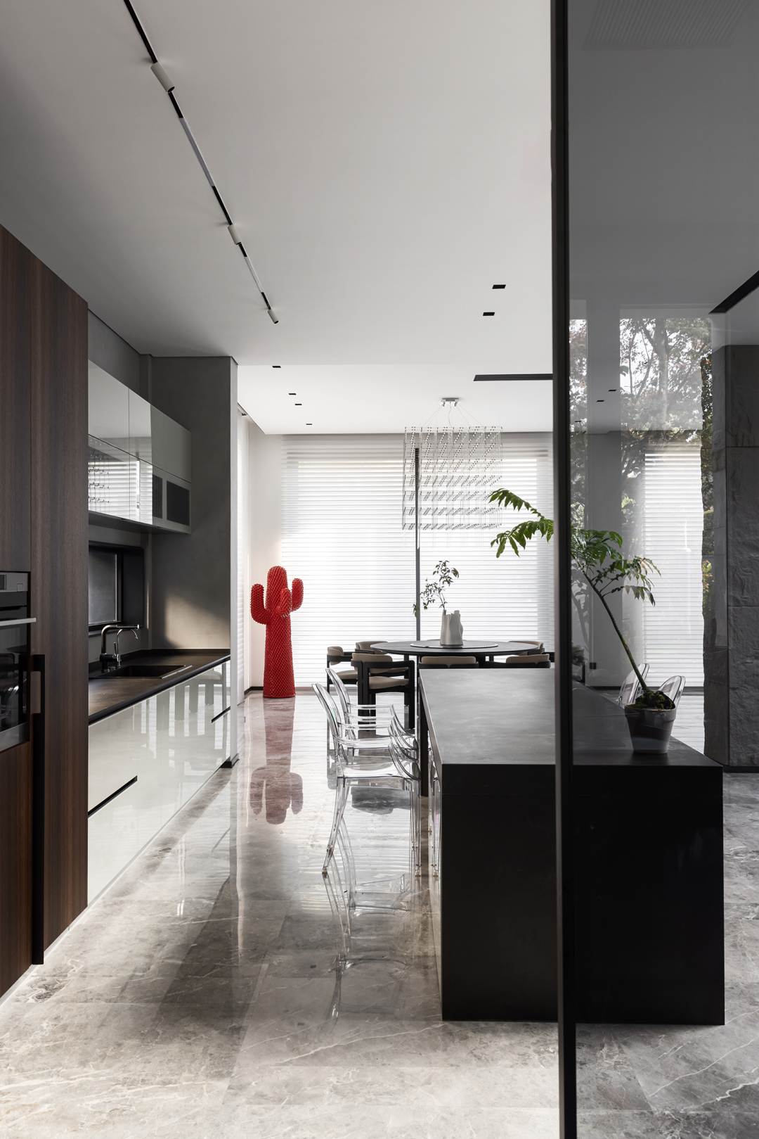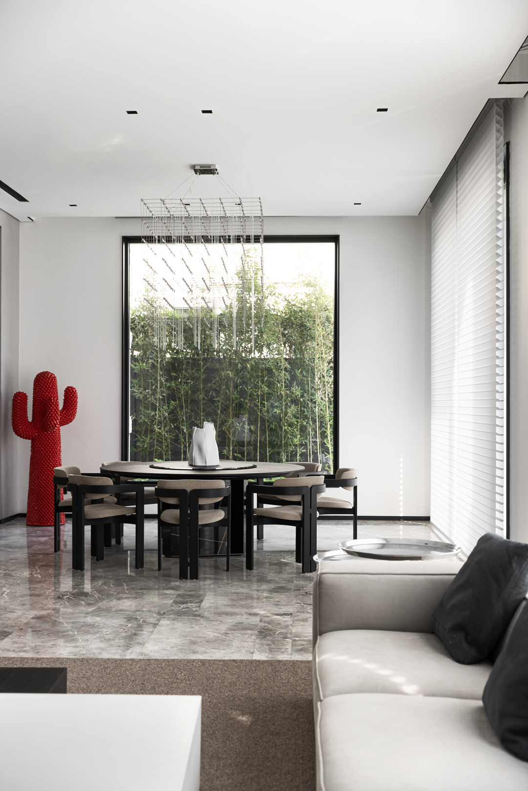 一碟一味,在中国人的文化里用餐就是烟火人间,一顿饭里有着最质朴的亲情,一张圆桌是最熟悉的团圆之意。黑色的圆桌椅颇有东方文化的雅致和内敛,现代极简主义灯饰,又融入了当代潮流的生活理念,落地窗将庭院里的竹子引入室内,“宁可食无肉,不可居无竹。”