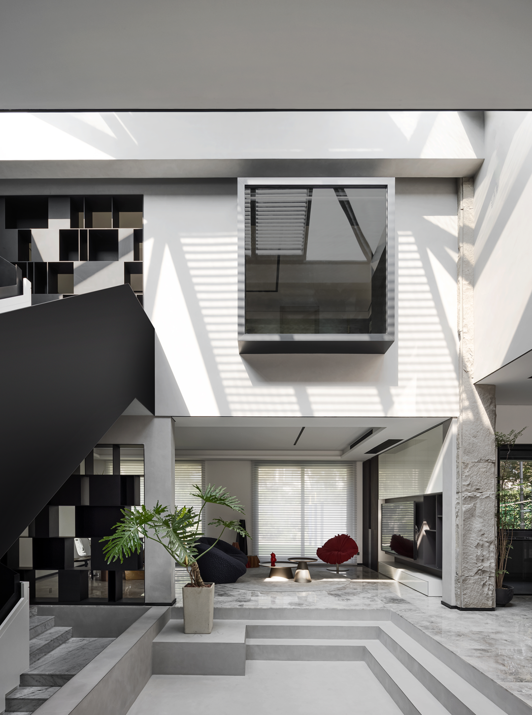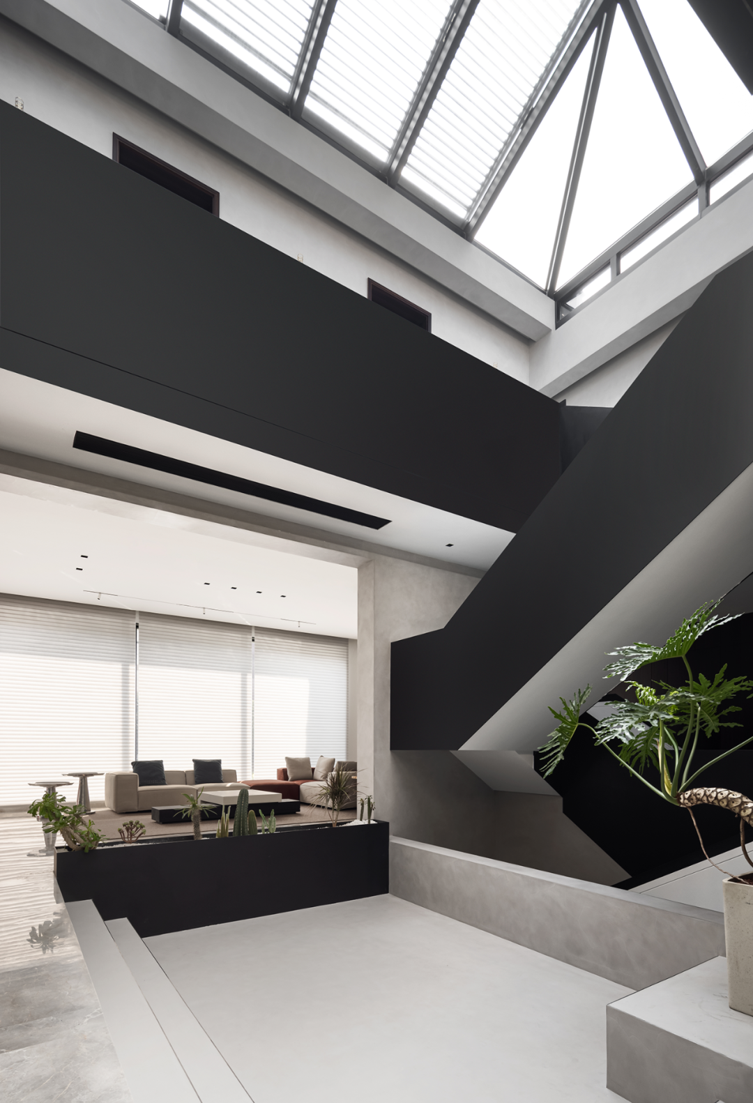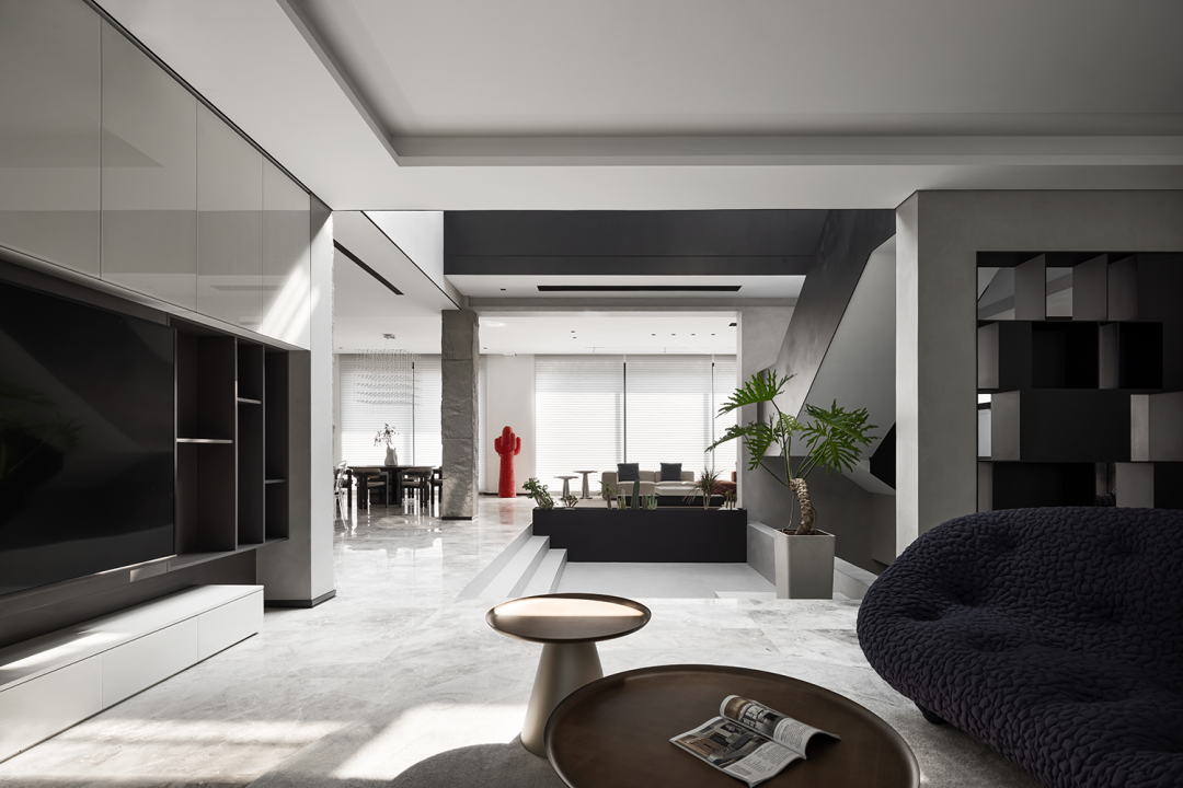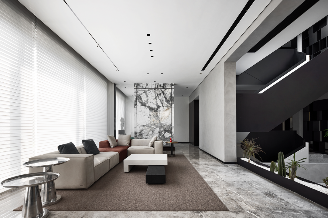 中庭挑高作为空间的核心精神,设计师在纵向与横向上以两条设计线完成整个空间的排布和功能划分。光线从顶部倾泻而下,视野开阔不受遮挡,空间的纵深感由此展开。黑色的楼梯如折纸层叠向上,空间的张力如戏剧冲突达到顶点。