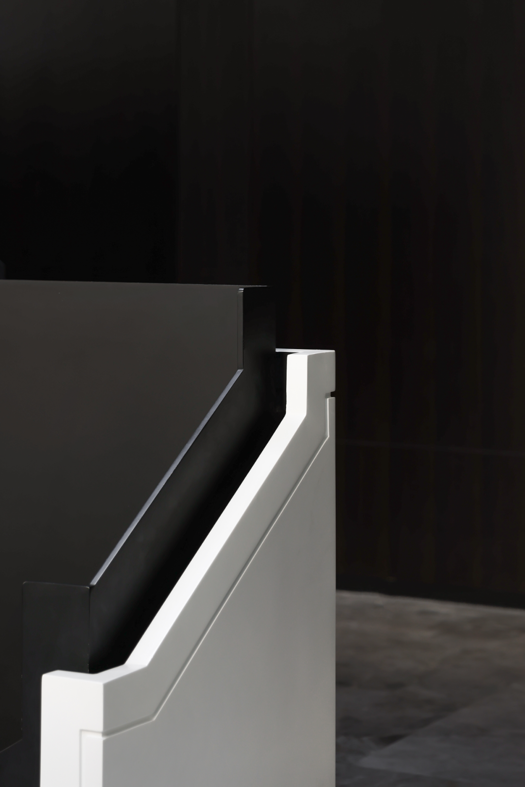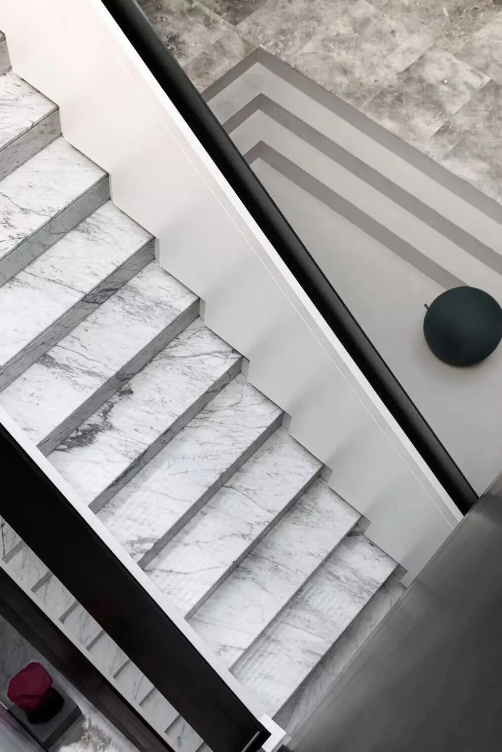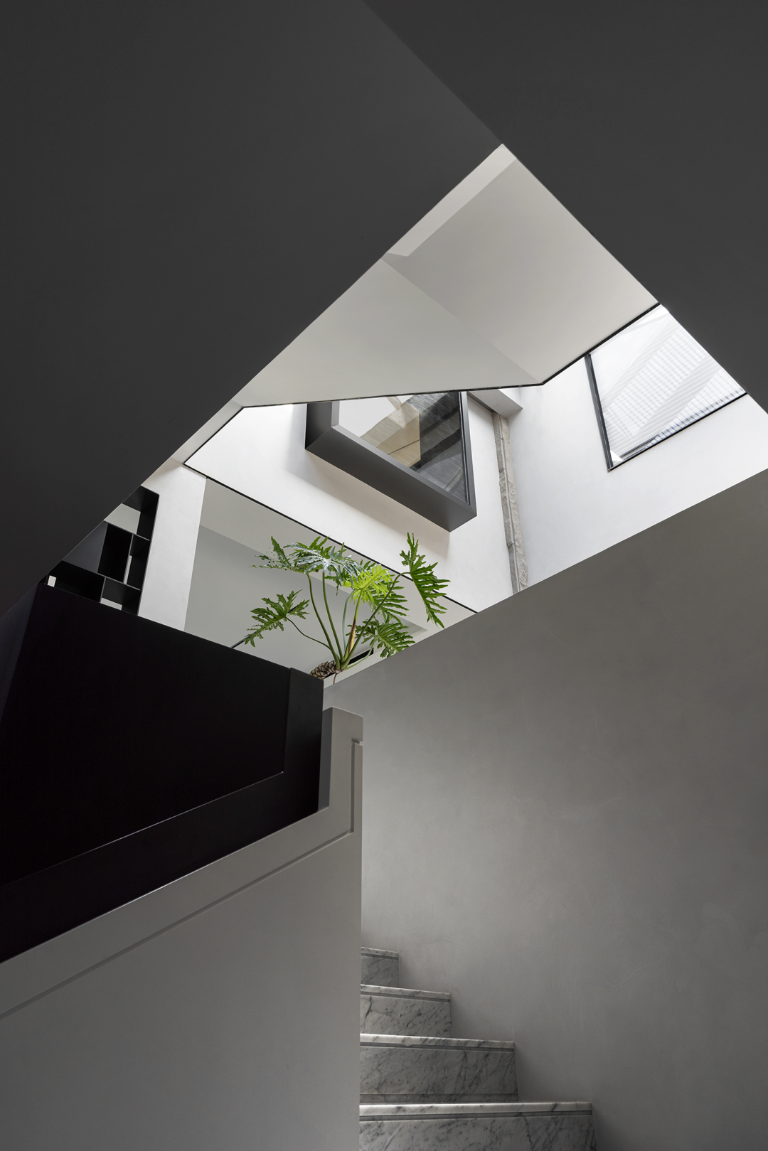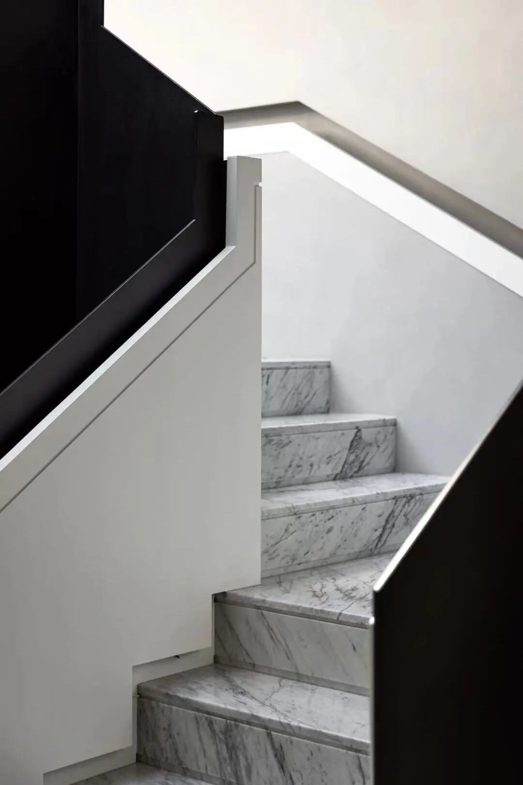 中庭挑高作为空间的核心精神,设计师在纵向与横向上以两条设计线完成整个空间的排布和功能划分。光线从顶部倾泻而下,视野开阔不受遮挡,空间的纵深感由此展开。黑色的楼梯如折纸层叠向上,空间的张力如戏剧冲突达到顶点。