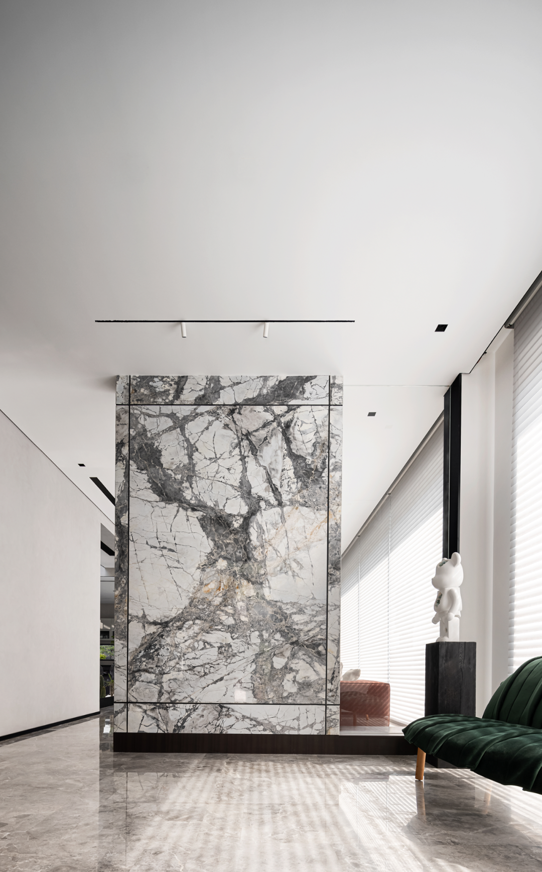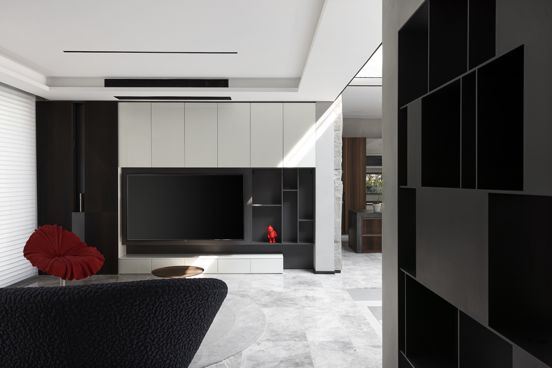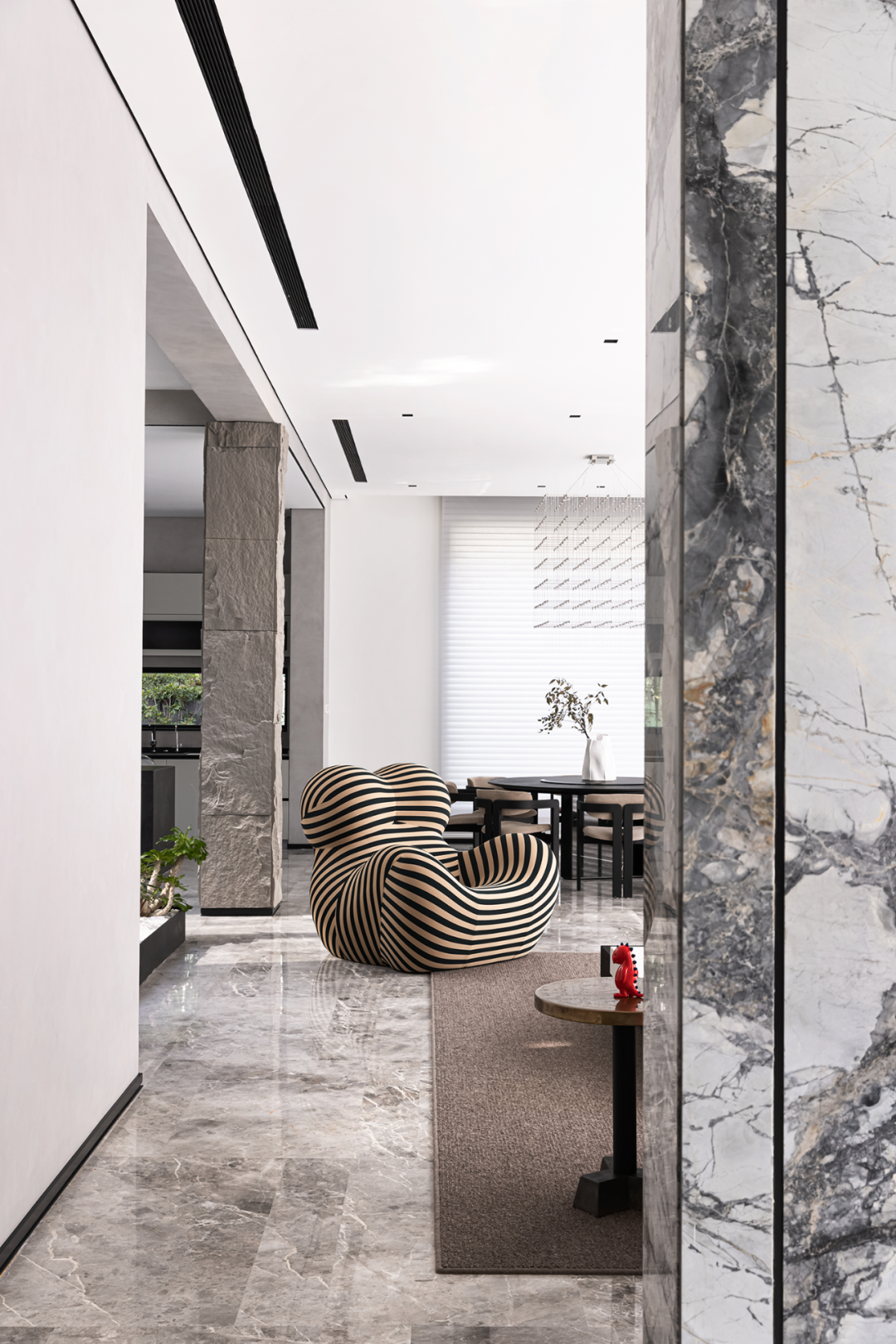 入户玄关以石材墙面作为分隔,水墨纹理,如远山烟雨,山涧流水,变幻万千,透露出静谧与禅意。大面积的开窗,充足的光线洒满客厅,让一切充满生机和能量。