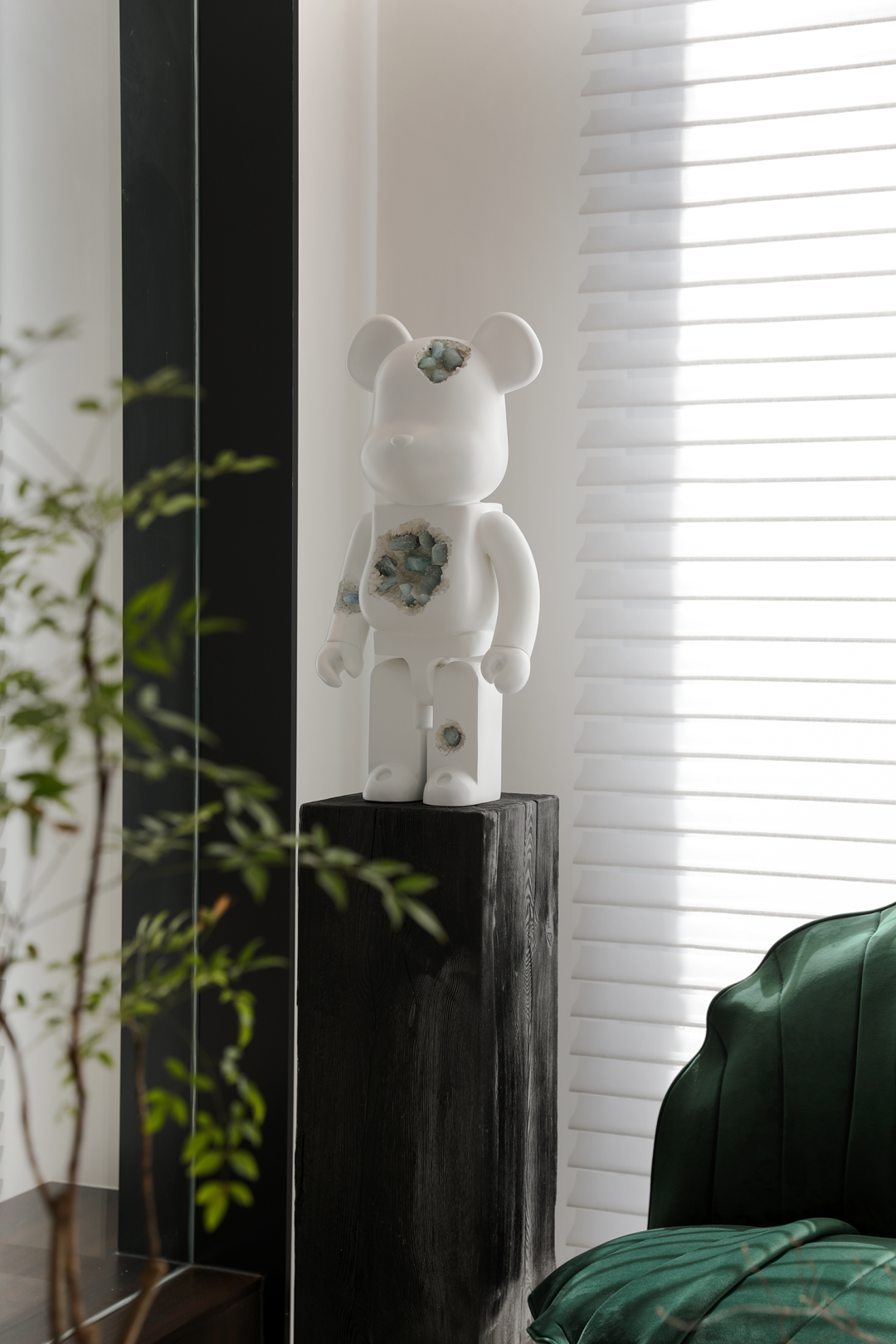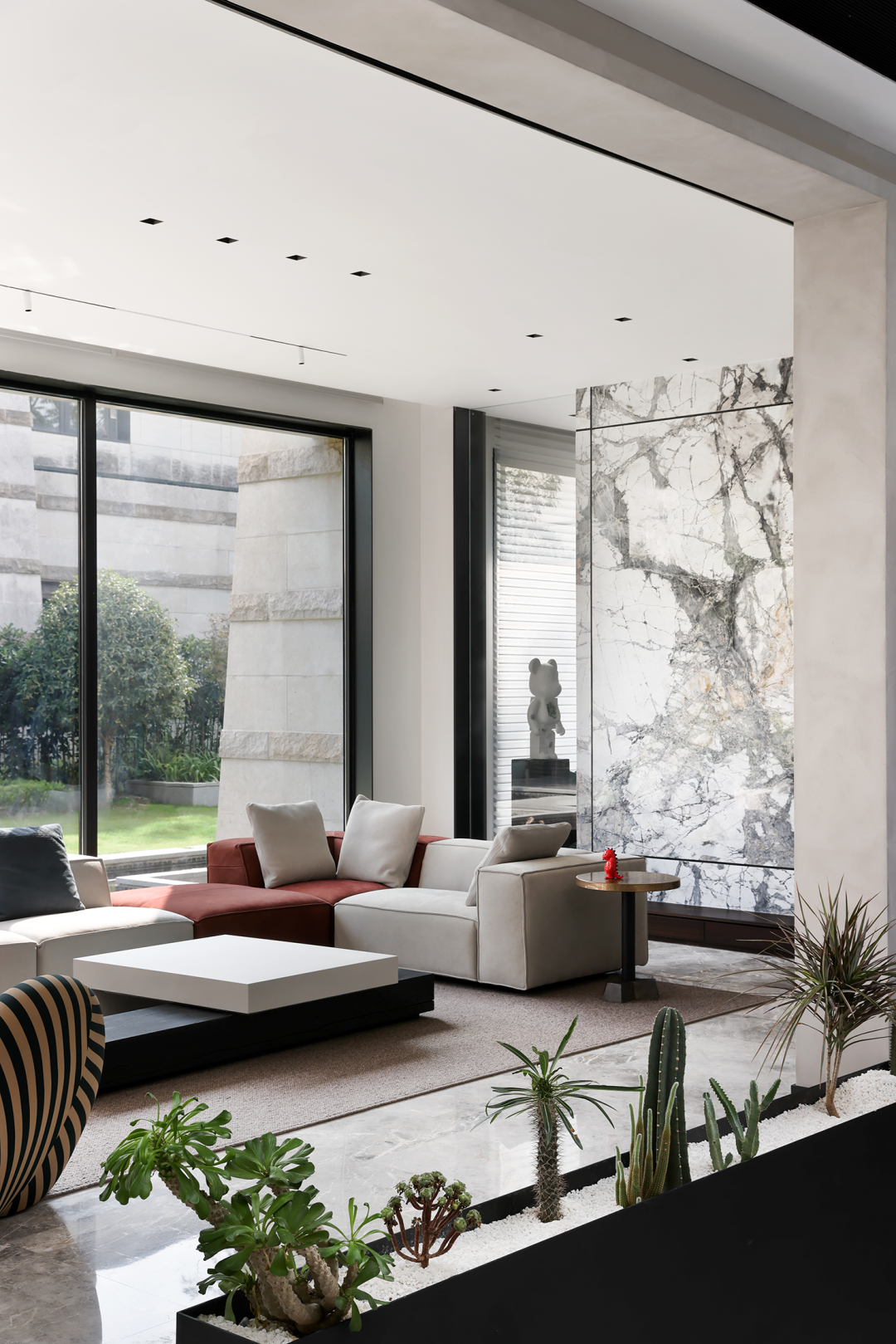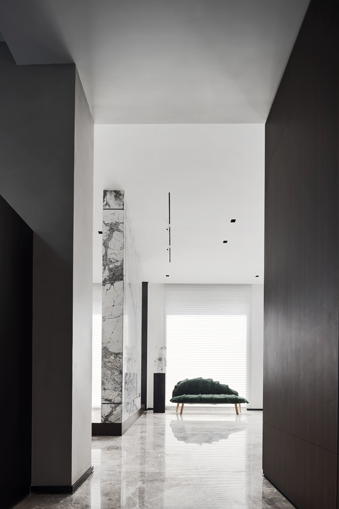 入户玄关以石材墙面作为分隔,水墨纹理,如远山烟雨,山涧流水,变幻万千,透露出静谧与禅意。大面积的开窗,充足的光线洒满客厅,让一切充满生机和能量。