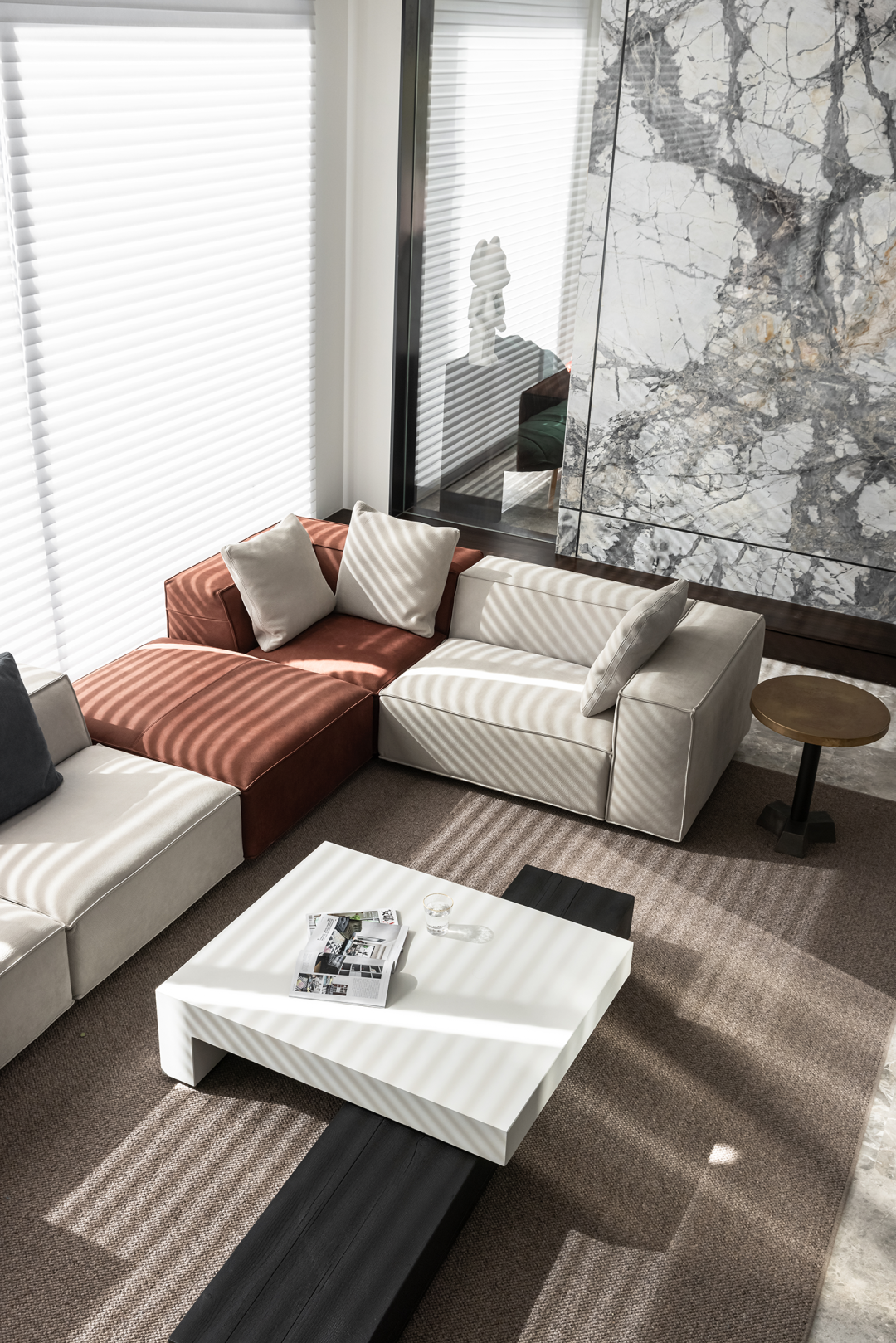 客厅平衡了舒适的功能性和正式的社交需要,低饱和度的色调,以咖啡色和棕色表达情绪。建筑是故事的容器,私宅尤其如此,居住者把全部的经历与情感投注到空间里,把它变成无限温柔与美好的所在。