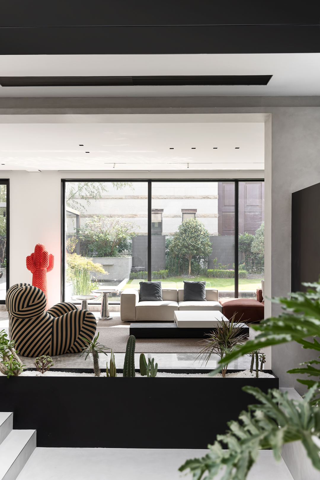 男主人的书房空间以线条勾勒出人字形顶面,黑色的墙面、书柜显露出沉稳的性格,红色的办公椅跳动着一抹热情。设计师打开墙体,以两扇独特的窗户与中庭形成互动。