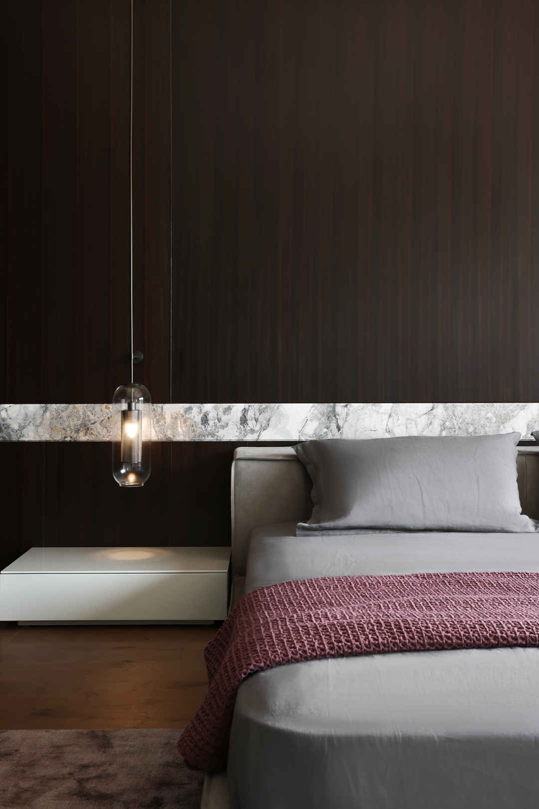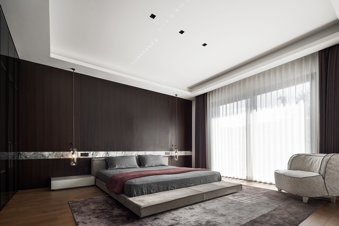 主卧更像是一种生活仪式,大面积木质背景穿插石材,诠释出理性主义的简约。浅米色绒面床与地毯,让空间更加舒适随性。材质的碰撞在细节上丰富了空间的体验。步入式衣帽间与尺度奢华的洗漱区,表明出主人对品质生活的追求。