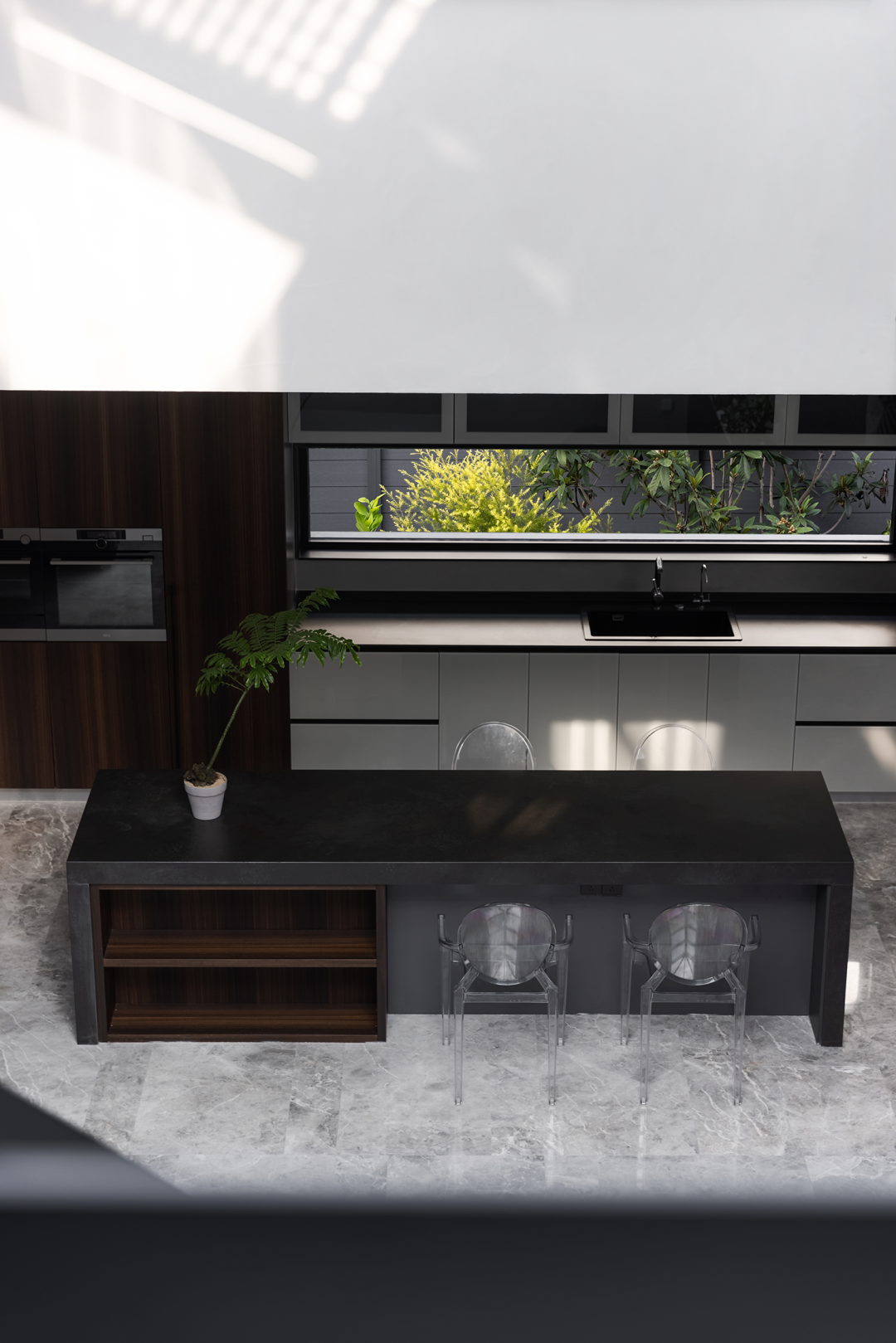 开放式的西厨简洁凝练,黑色的中岛岩板台面与木色的橱柜冷暖交替。横向长条开窗,拉伸了空间视觉,临窗是户外庭院,景色怡人,树影婆娑颇具野趣。