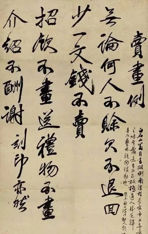 卖画例:无论何人,不赊欠,不退回。少一文钱不卖。招饮不画,送礼物不画,介绍不酬谢。刻印亦然。