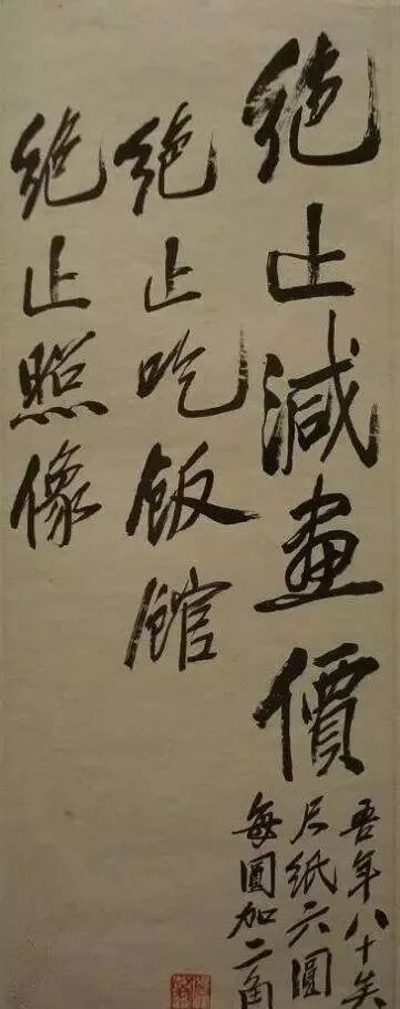 绝止减画价(吾年八十矣,尺纸六元,每元加二角),绝止吃饭馆,绝止照相。