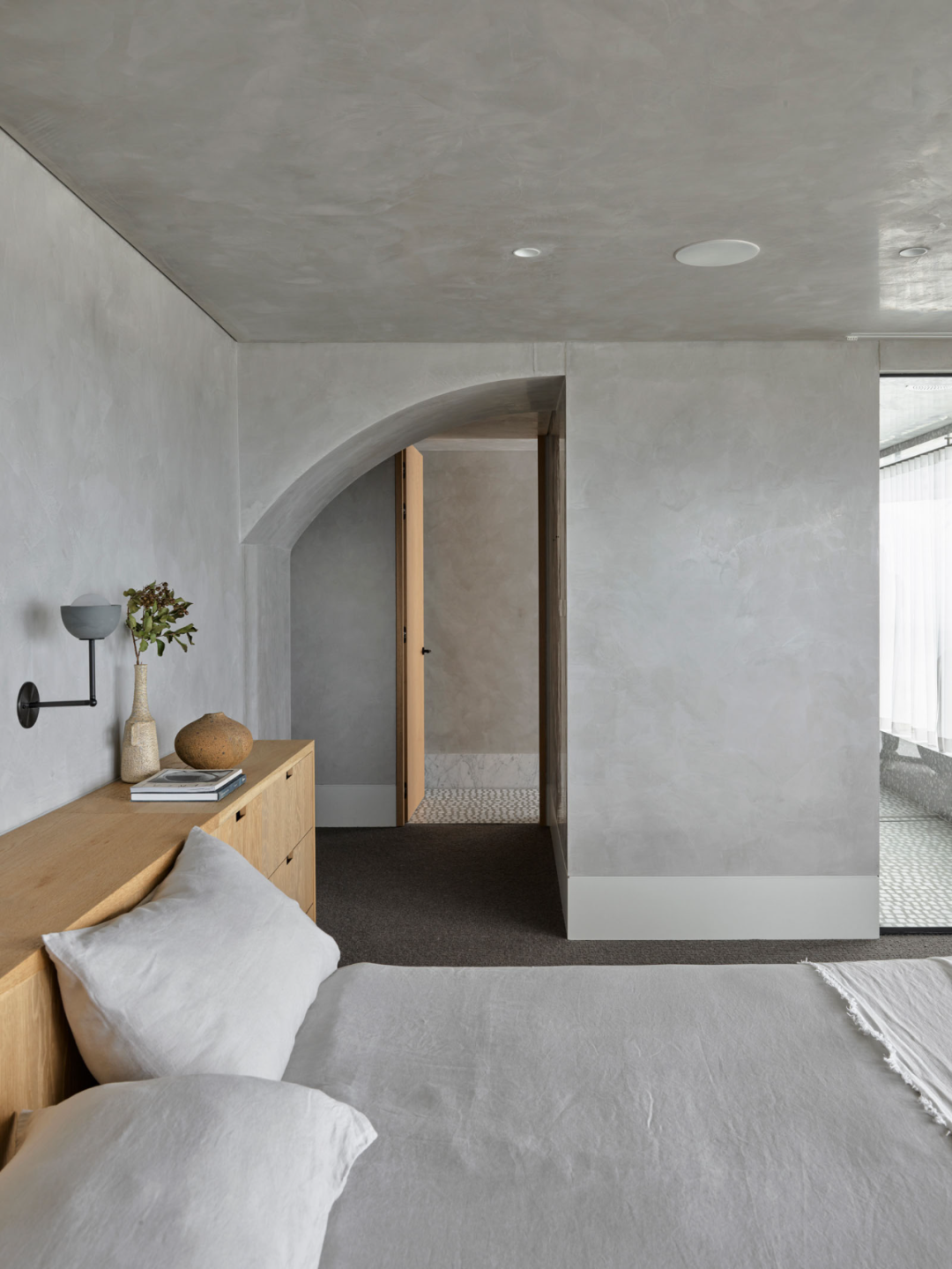 位于上层的卧室设计打破空间束缚,裸露着混凝土饰面,将美感和空间感融于一体。