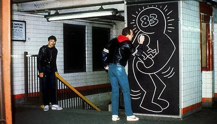 1970年代末期,街头艺术家们像分散游戏的孩子们开始将整座城市乐园当作画板:李·奎诺尼斯 (Lee Quiñones)、“妙手佛迪” (Fab 5 Freddy) 用涂鸦大规模地“轰炸”地铁车厢,让-米歇尔·巴斯奎特与Al Diaz将诗歌和谜一样的哲学词句涂绘在苏荷区附近的街巷并署名“SAMO ©”(意为“same old shit”=老一套),彼时遍布城中但仍维持匿名的“SAMO ©”是与今日的Banksy一样神秘的存在;同一时期,凯斯·哈林 (Keith Haring) 则用白色粉笔在地下铁那些尚未被征用广告牌的黑色底板上进行涂绘——发光的小人、吠叫的狗、心形、飞碟、十字架,这些转瞬即逝的作品几乎立刻就会被清理掉,但哈林采用的这种可以快速绘制的简单鲜明的卡通语汇几乎可以被任何人轻易读取和理解。