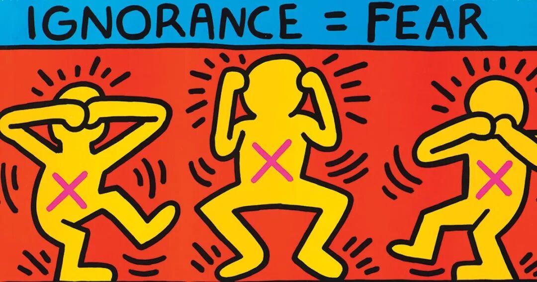 下图:凯斯·哈林为ACT UP创作的海报《无知=恐惧/沉默=死亡》 (Ignorance = Fear / Silence = Death)