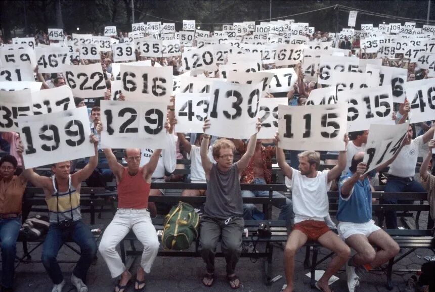 下图:1983年8月8日,在纽约中央公园举行的支持艾滋病受害者的示威中,人们举起代表艾滋病受害者人数的标志