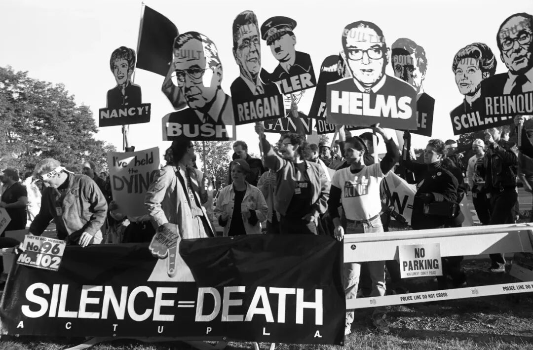 上图:1988年10月11日,艾滋病活动团体ACT UP的成员在食品和药物管理局总部举着写有“沉默等于死亡”的横幅