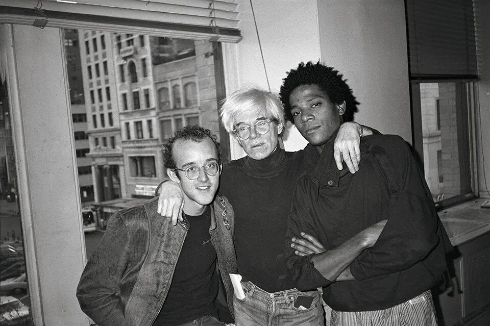 凯斯·哈林、安迪·沃霍尔、让-米歇尔·巴斯奎特在沃霍尔的工作室中合影,1984年4月23日