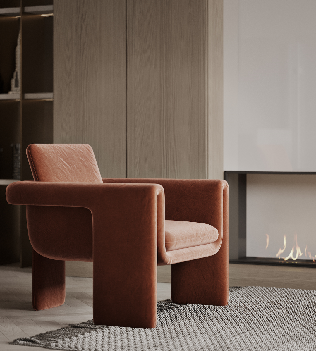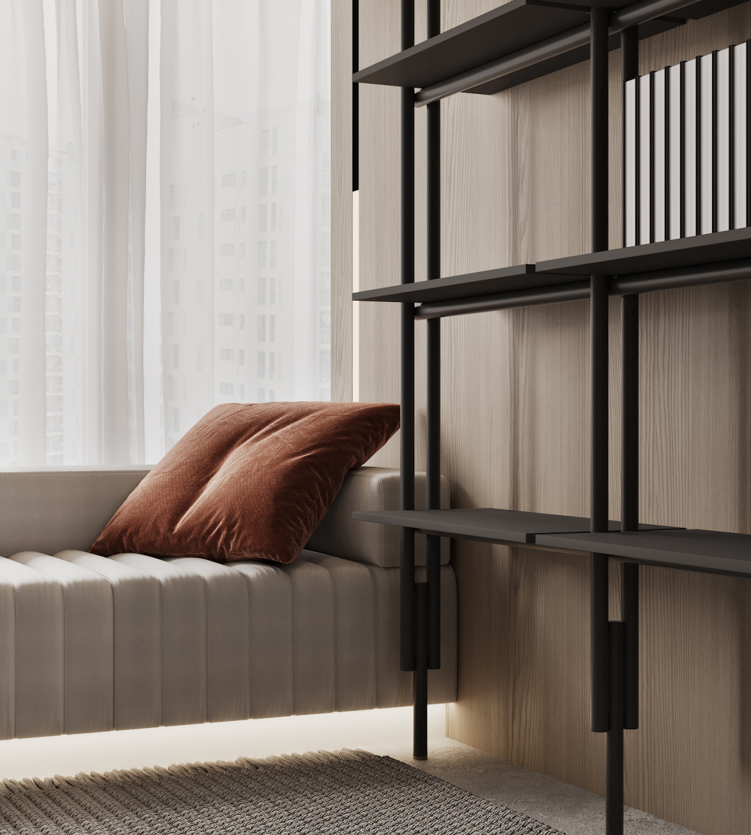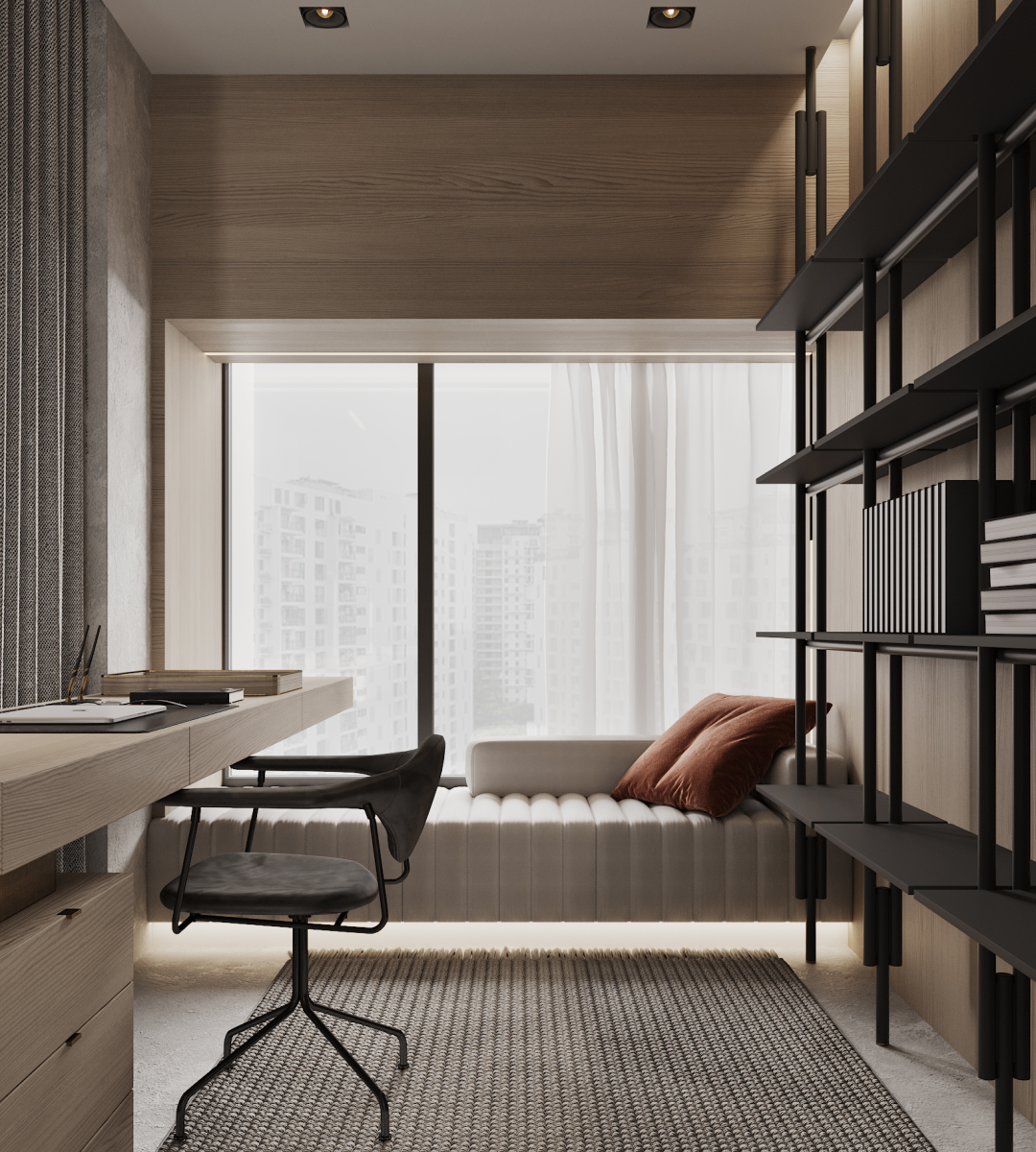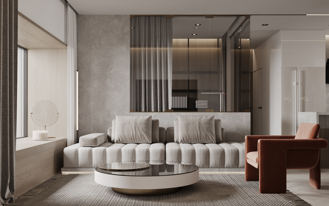 进一步采用玻璃隔断,保持沙发后方书房的通透景深,屋主可以在室内随心转换办公空间,起居工作时也能酝酿创作力。