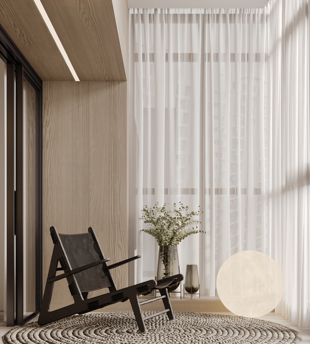 正如从客厅至餐厨区,利用温润木质形成连贯性,墙面则揉合朴实灰阶混凝土成为清晰划分,经由自然元素烘托温和气息。
