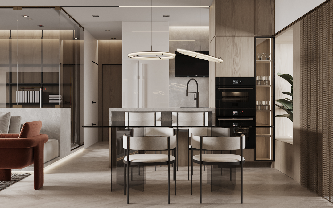 大面积木色串接空间轴线,减少视觉断点,使柔软温度流动于开放厨房空间,璃餐桌的透明感,巧妙烘托了室内活泼度。