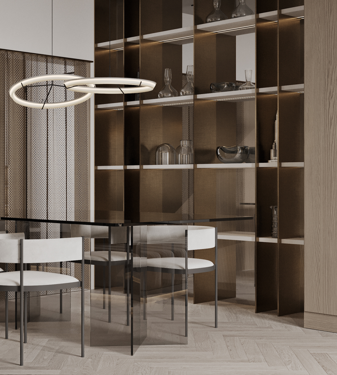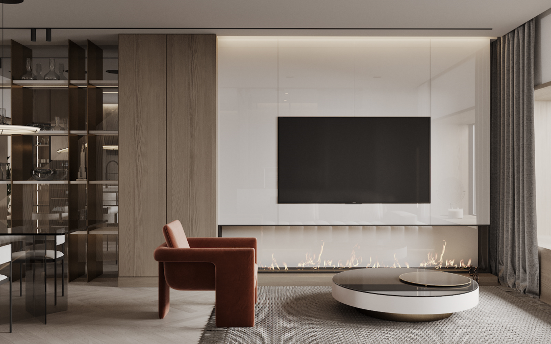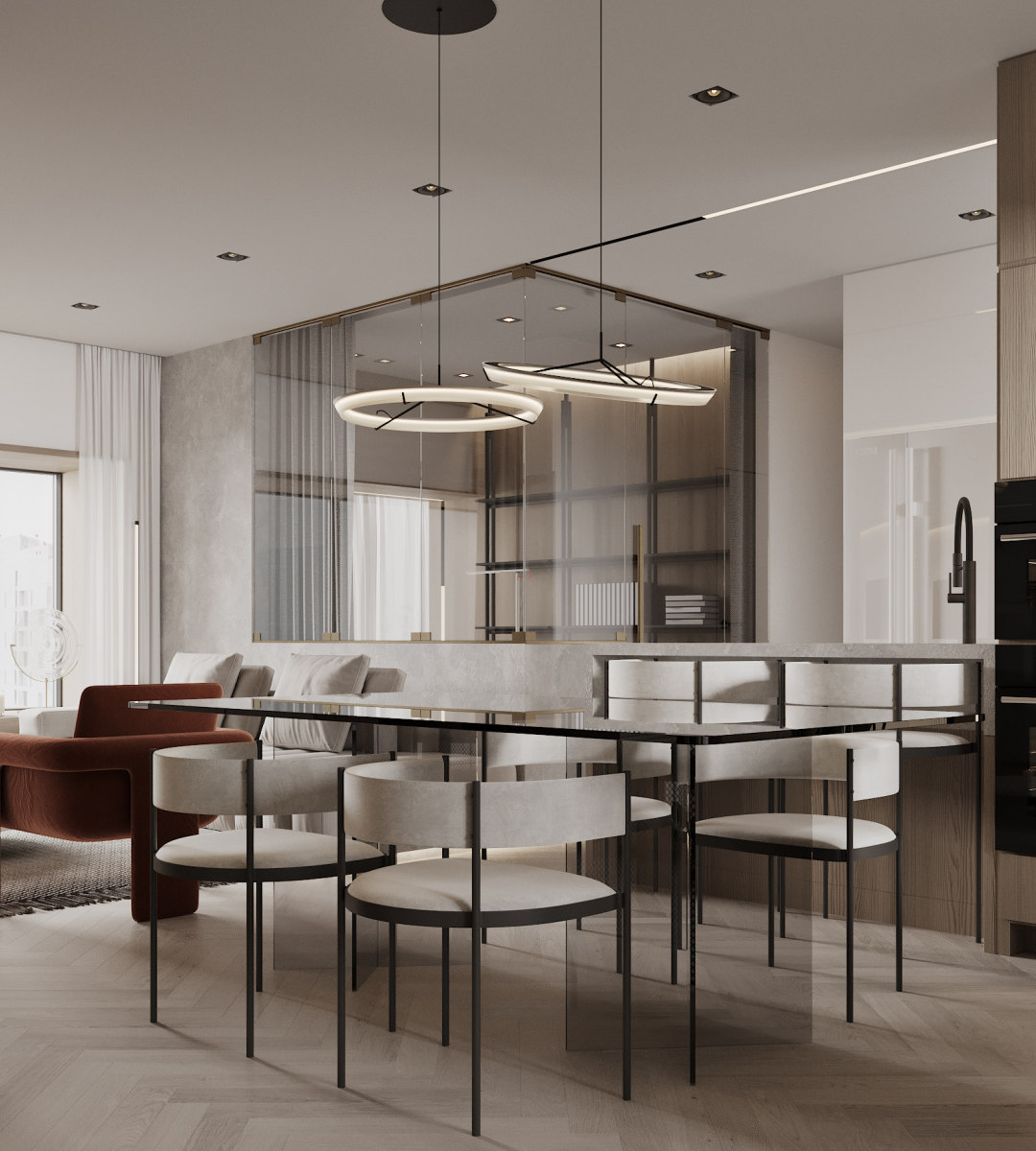 简约干净室内基调也能透过玻璃、镜面增进通透感,工作室 Yuliia Zhatko 提出的概念设计以一字型布局展开,令这套 80㎡ 公寓视野变得更开阔平衡。