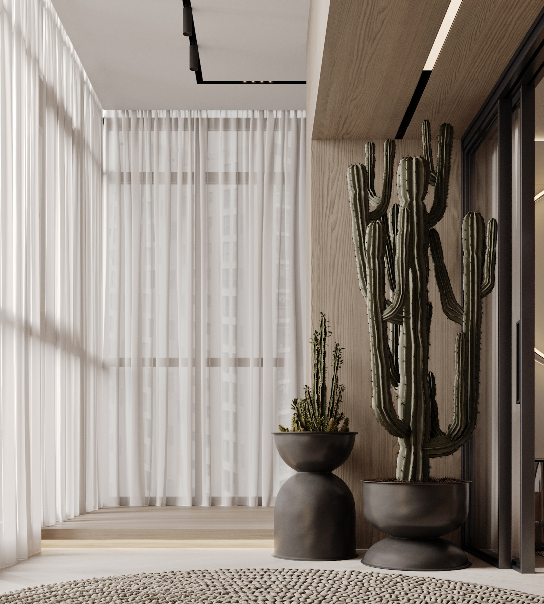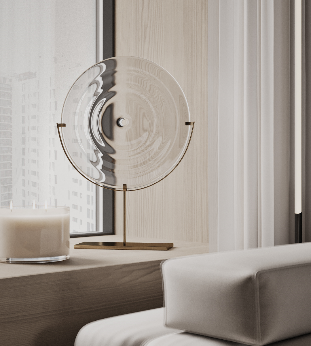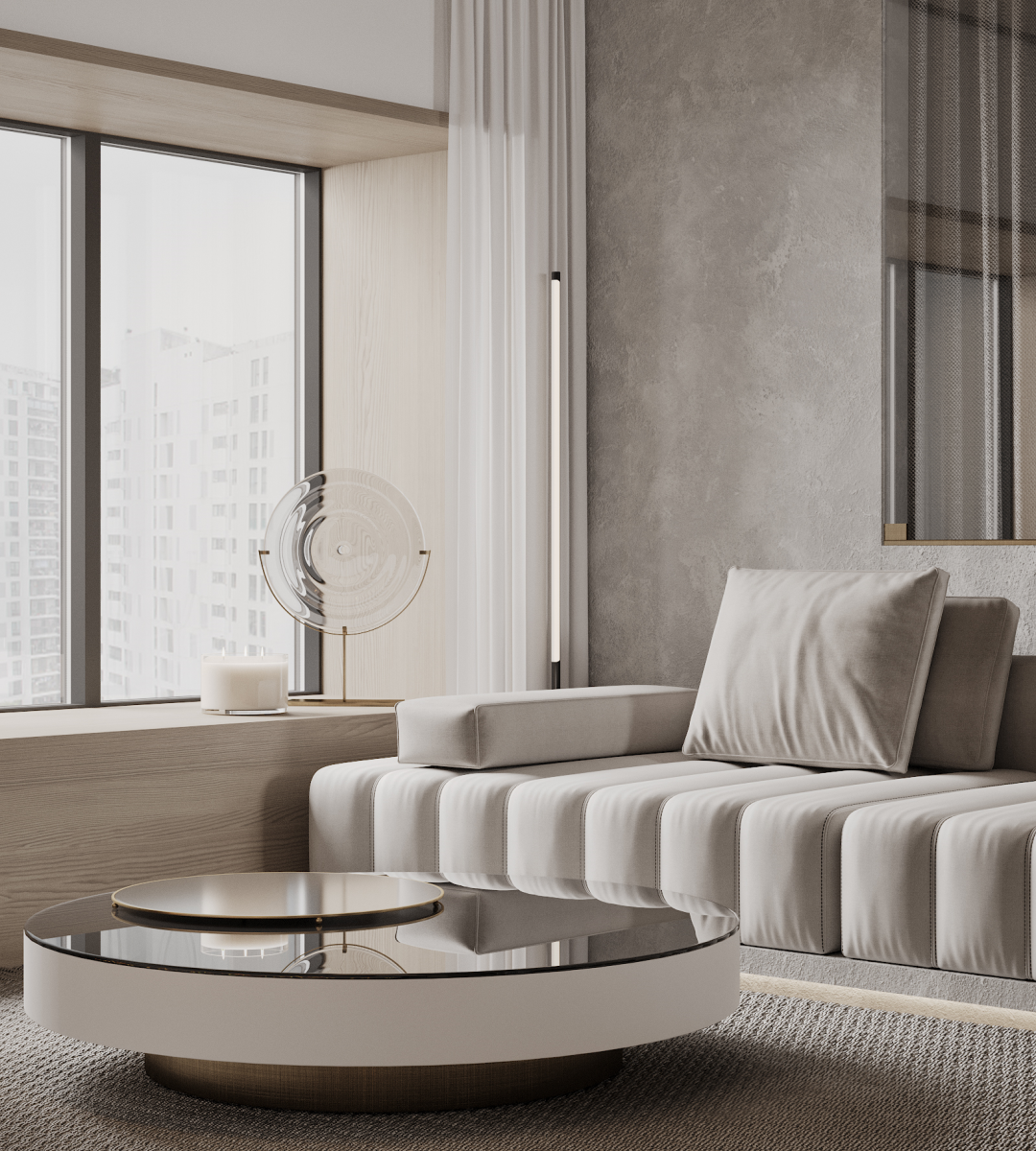 简约干净室内基调也能透过玻璃、镜面增进通透感,工作室 Yuliia Zhatko 提出的概念设计以一字型布局展开,令这套 80㎡ 公寓视野变得更开阔平衡。