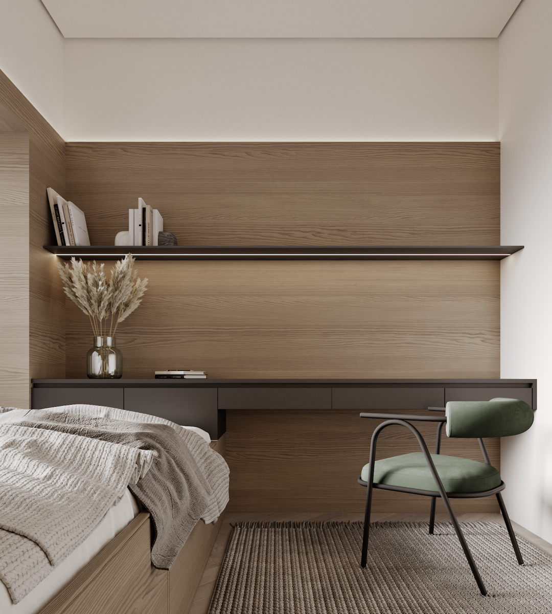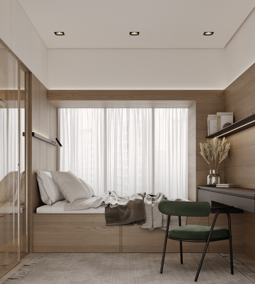 侧卧可作为客房或者小孩房,利用飘窗台面,定制床身带有收纳功能。