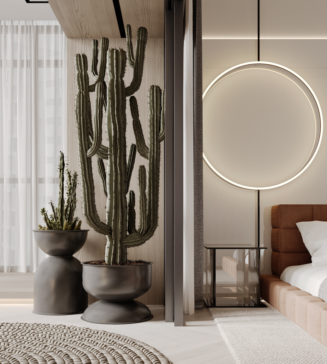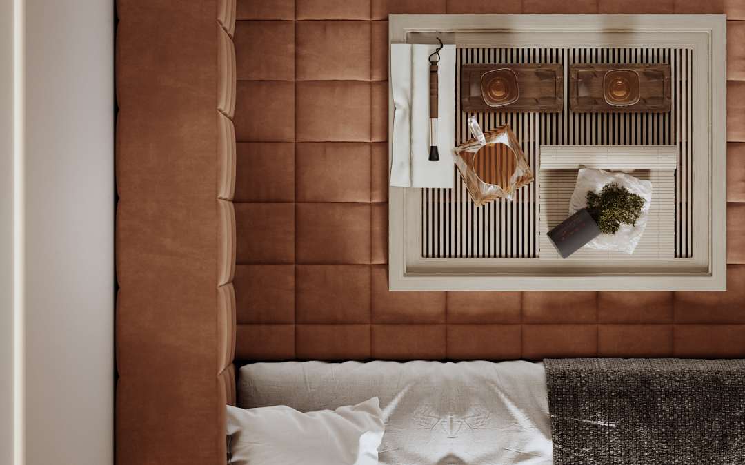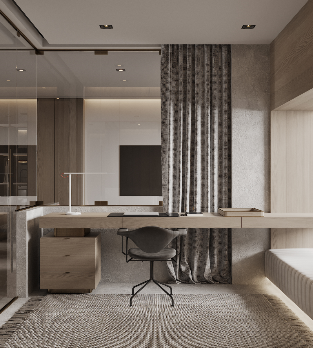 主卧墙面涂刷奶油灰,简单的暖色基调能让心灵放松,配合能反射空间的玻璃饰面,让空间尺度得到拉伸。