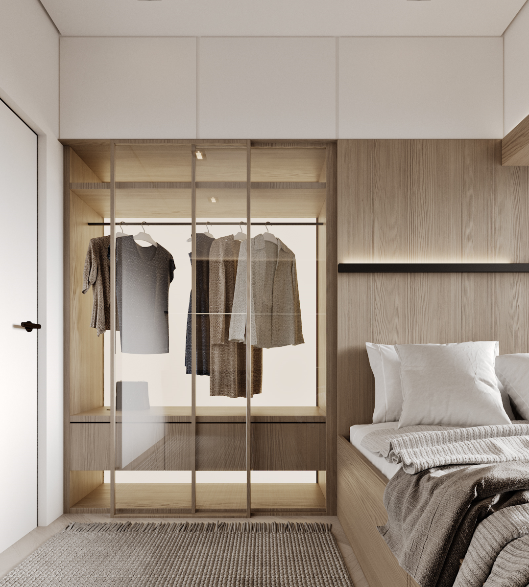 衣柜顶部拓展出收纳柜内里装有灯箱,同样选用透明玻璃门视觉上更显大。