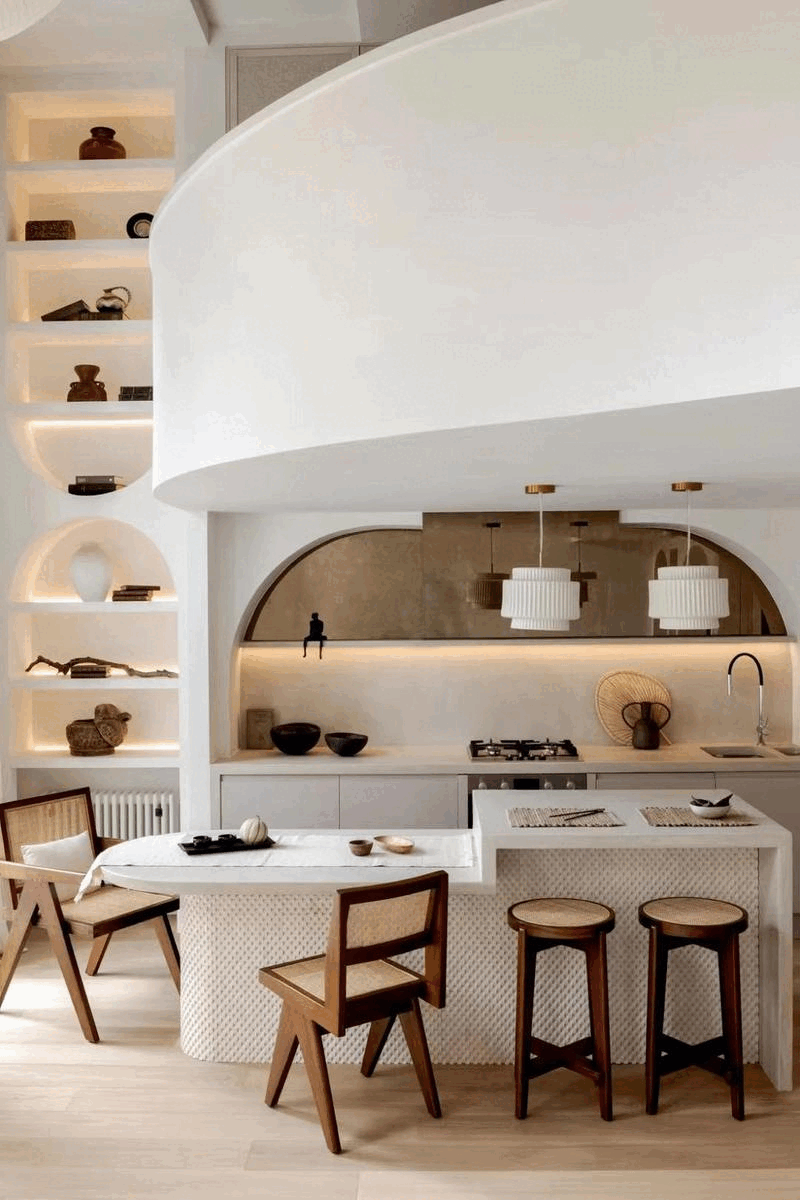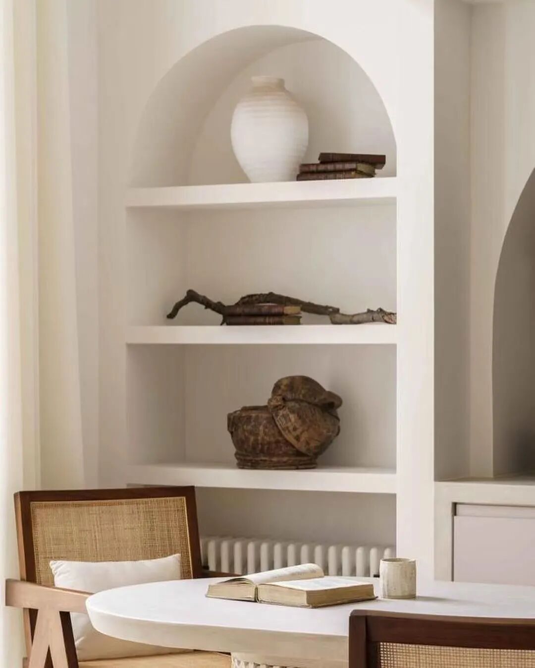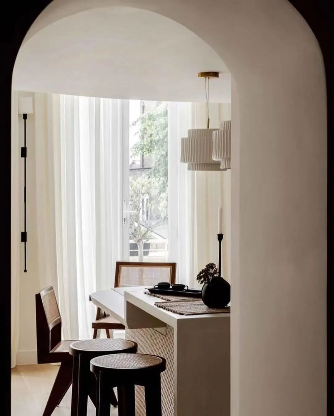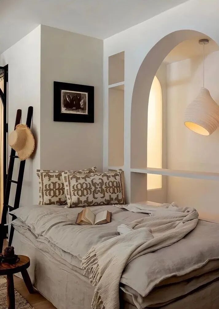 浸润在温柔与艺术氛围中,又给深灰色留出余地,让感性与理性在空间中对话。拱形元素在空间多处使用,简约又兼具古典气质。