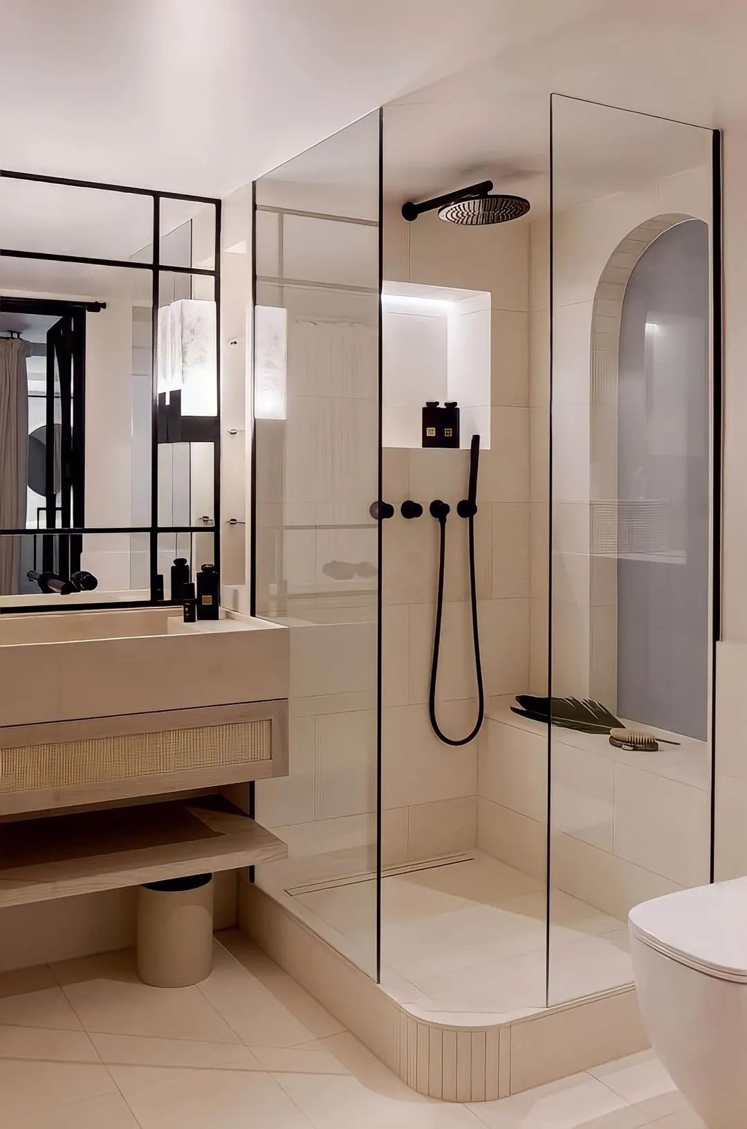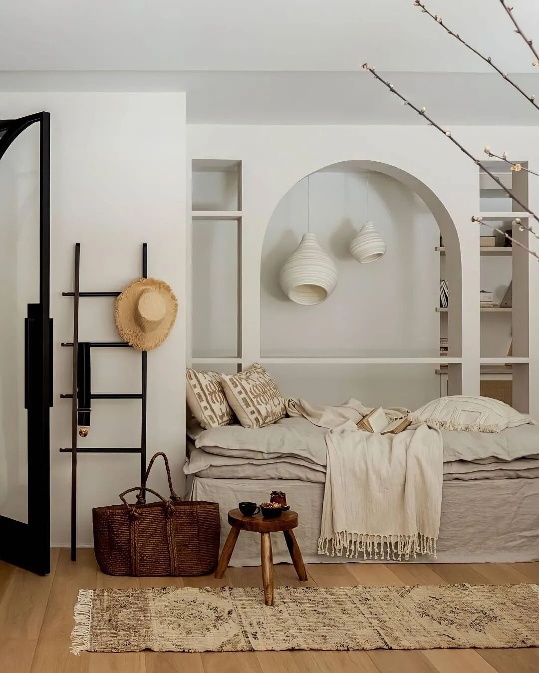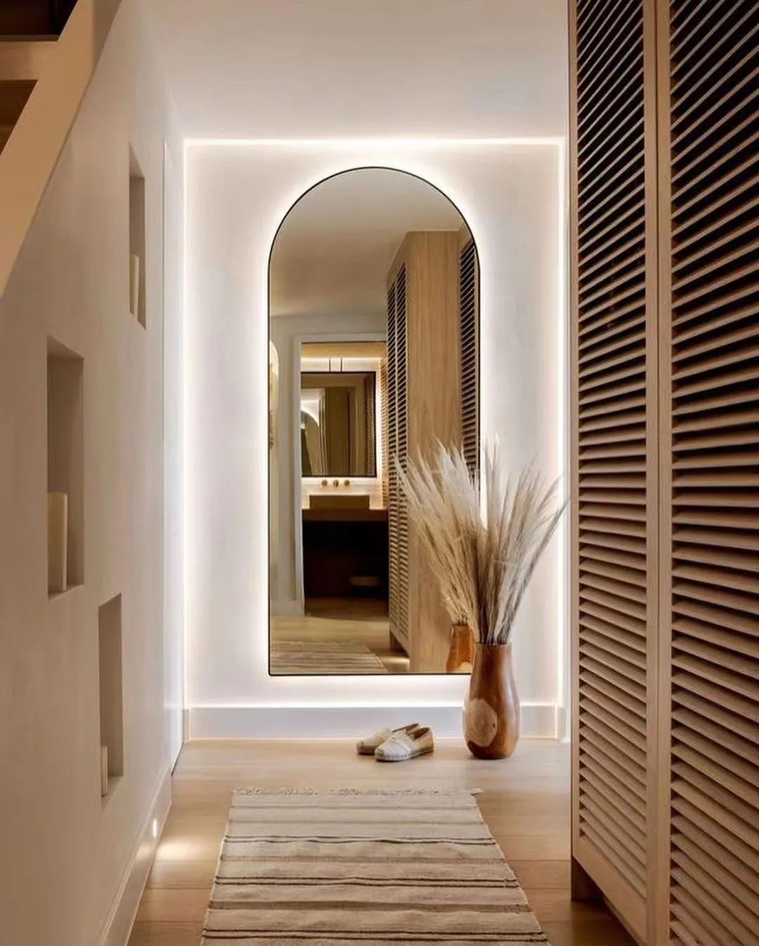 浸润在温柔与艺术氛围中,又给深灰色留出余地,让感性与理性在空间中对话。拱形元素在空间多处使用,简约又兼具古典气质。
