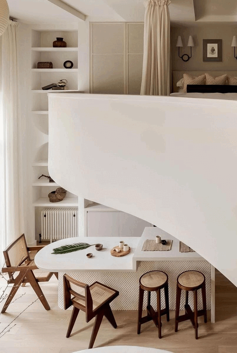 餐桌上方被大面积的二层露台遮住,但白色的沿袭和大胆的曲线,让其留有厚实私密的特点,去除了小空间可能的压抑,既与沙发和咖啡桌相呼应,又可以很好的收放空间的去留。
