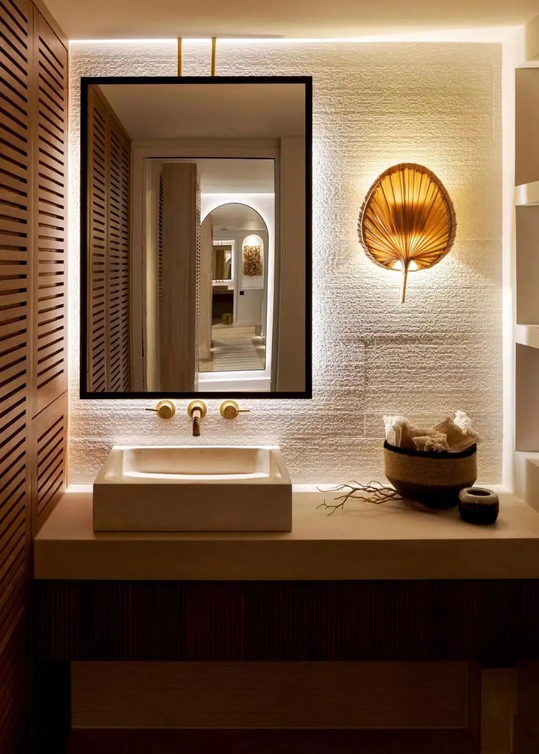 可能是受风水的影响,屋主在必须安放镜子的地方,用了镜镜相对的格局。蒲扇变成了壁灯,开启时灯光透过扇面,仿佛悬浮在空中。