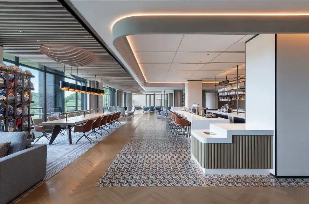 步入酒店大堂的第一感觉就是通透、流畅,空间尽头的&More咖啡充满年轻时尚的气息。在这里,共享长桌、垂吊式壁炉和散落的沙发椅,与窗外静谧的湖泊相映衬。下午或者夜晚,很多客人喜欢喝一杯桂花拿铁或者咖啡马提尼,坐在窗边聊天、工作。据介绍,作为喜来登全新设计的核心空间,酒店大堂被赋予“开放式共享空间”的定位,&More咖啡是亮点,集酒吧、咖啡厅和市集三种功能于一体。