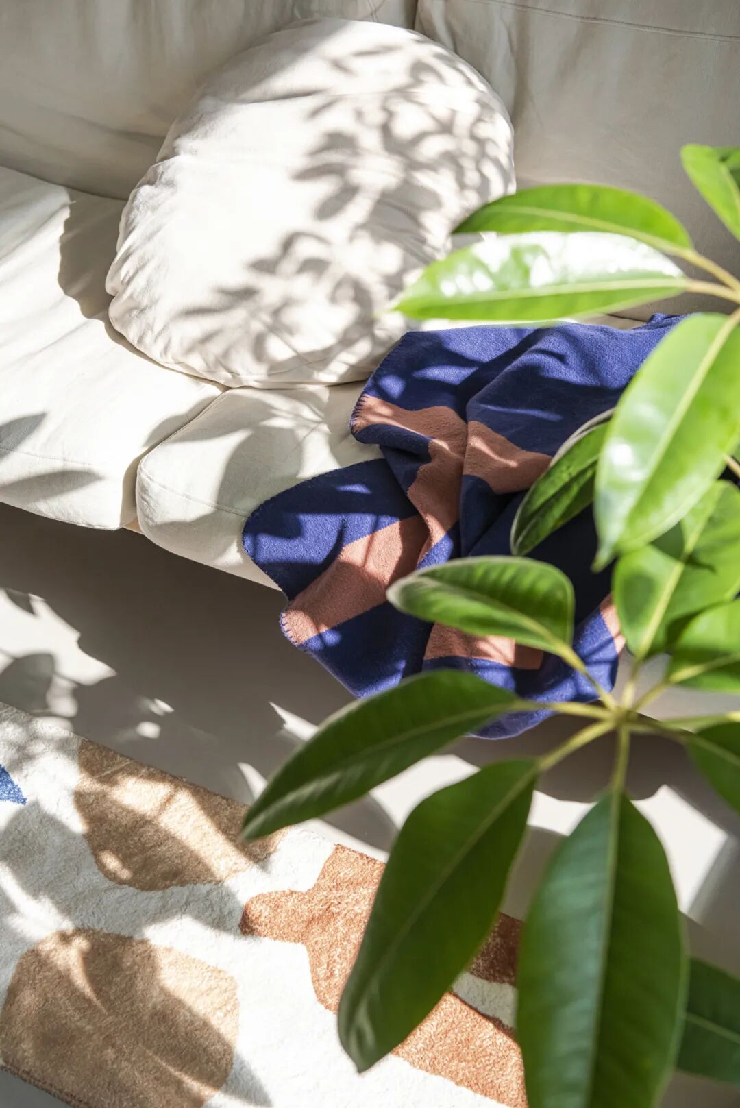 地毯的花纹和旁边的绿植一样,这也是买下它的原因。尤其是在阳光下,影子和地毯融为一体。