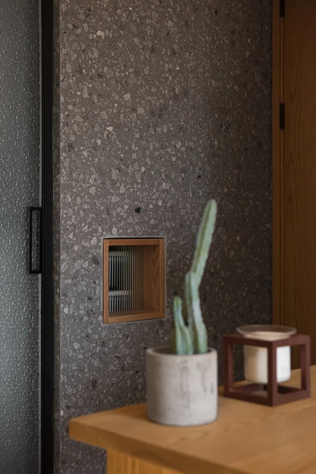 主卫的墙体部分使用了大理石,但是为了透光以及避免太压抑,我们在墙体上挖了几个洞,并且安装了木框和长虹玻璃,就像开了一个小窗。灯光下格外有趣,整个墙面都灵动了许多。