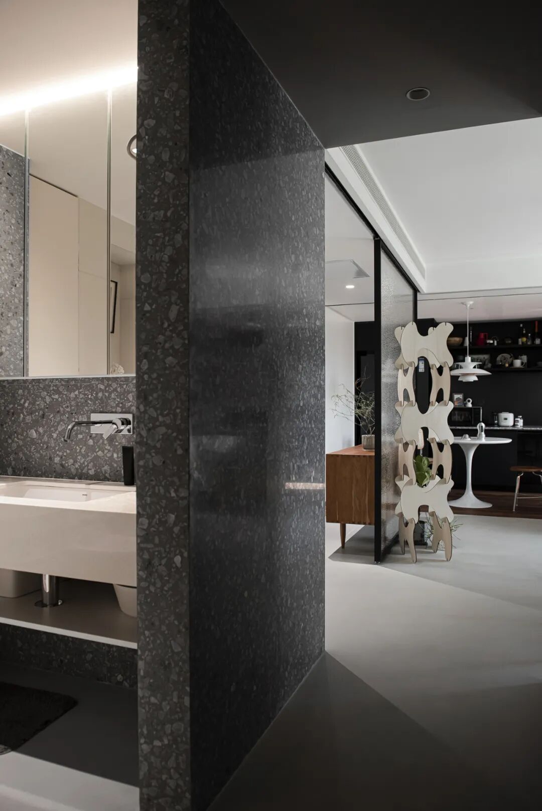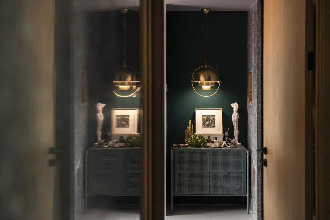 走廊区域我们使用的是有反光度的大理石,总能映出厨房的影子,而光影之下,也让原本狭窄的走道,变得宽敞大气许多。