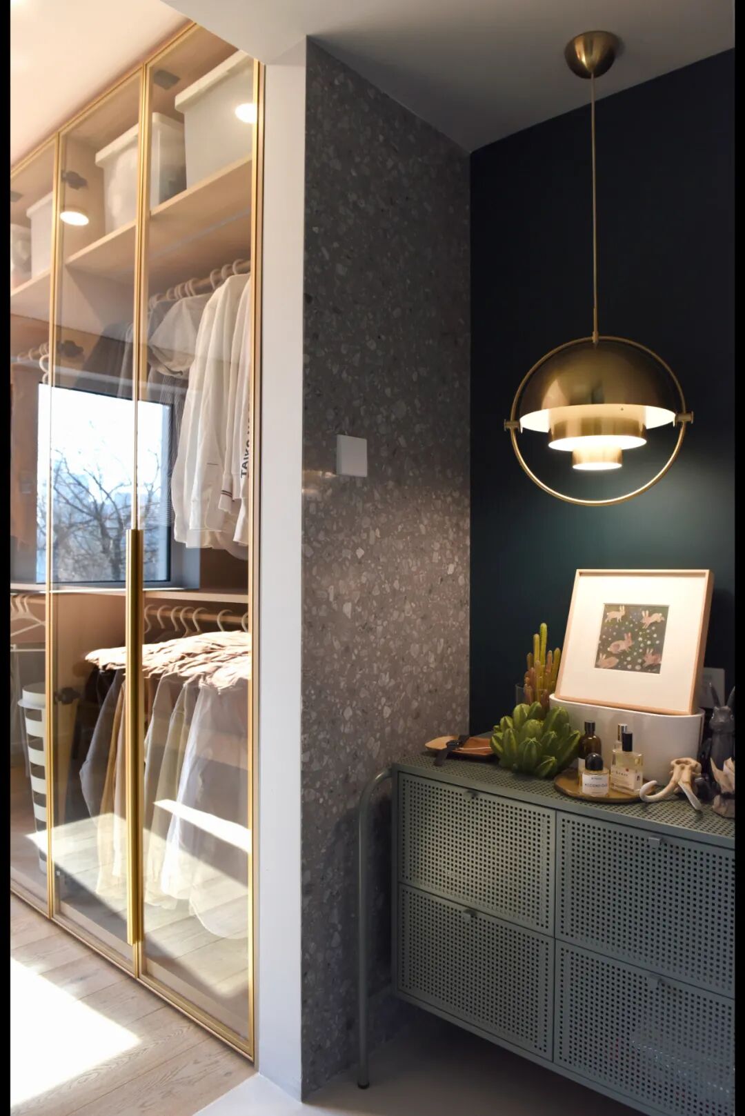 走进他家,总能有很多吸引人眼球的地方,全黑的厨房、走廊尽头的黄铜吊灯、浴室里的挂画、不锈钢的摆件儿、红色的水壶……85平的空间里,每个角落都是风景。上一秒感觉自己在巴黎精致的小公寓里,下一秒好像又进入到了复古洋房。
