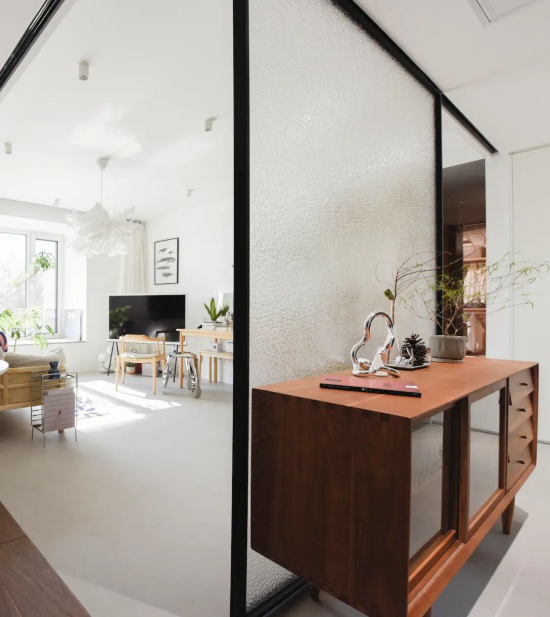 由于玄关进门正对着的就是客厅,设计师就用压花玻璃做了屏风,保证玄关处的光线之外,也能形成空间的分隔。