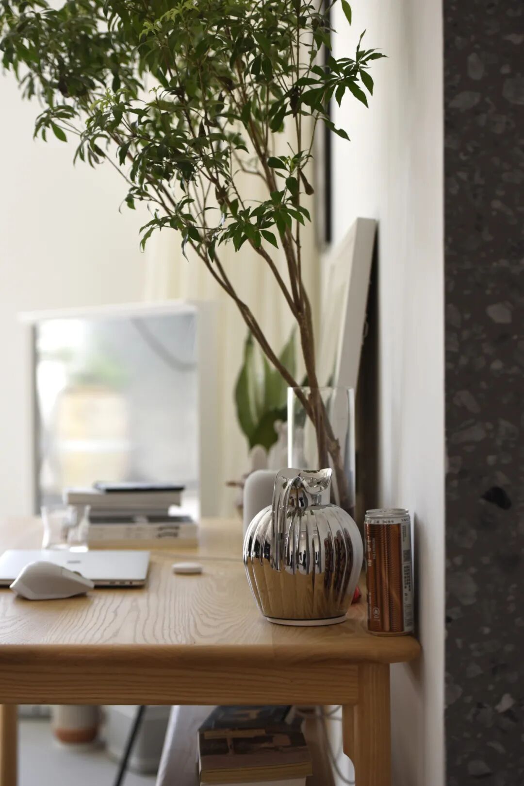 屋主格外喜欢不锈钢,所以家从咖啡壶到椅子到花瓶,甚至饮料都是不锈钢色。