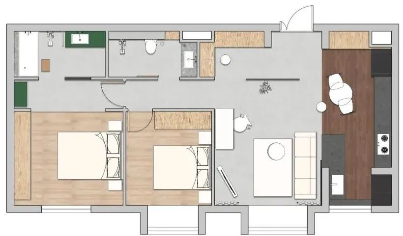 这个区域与走廊尽头的厨房相对,卧室门打开的时候,站在客厅里就能看到两种氛围。