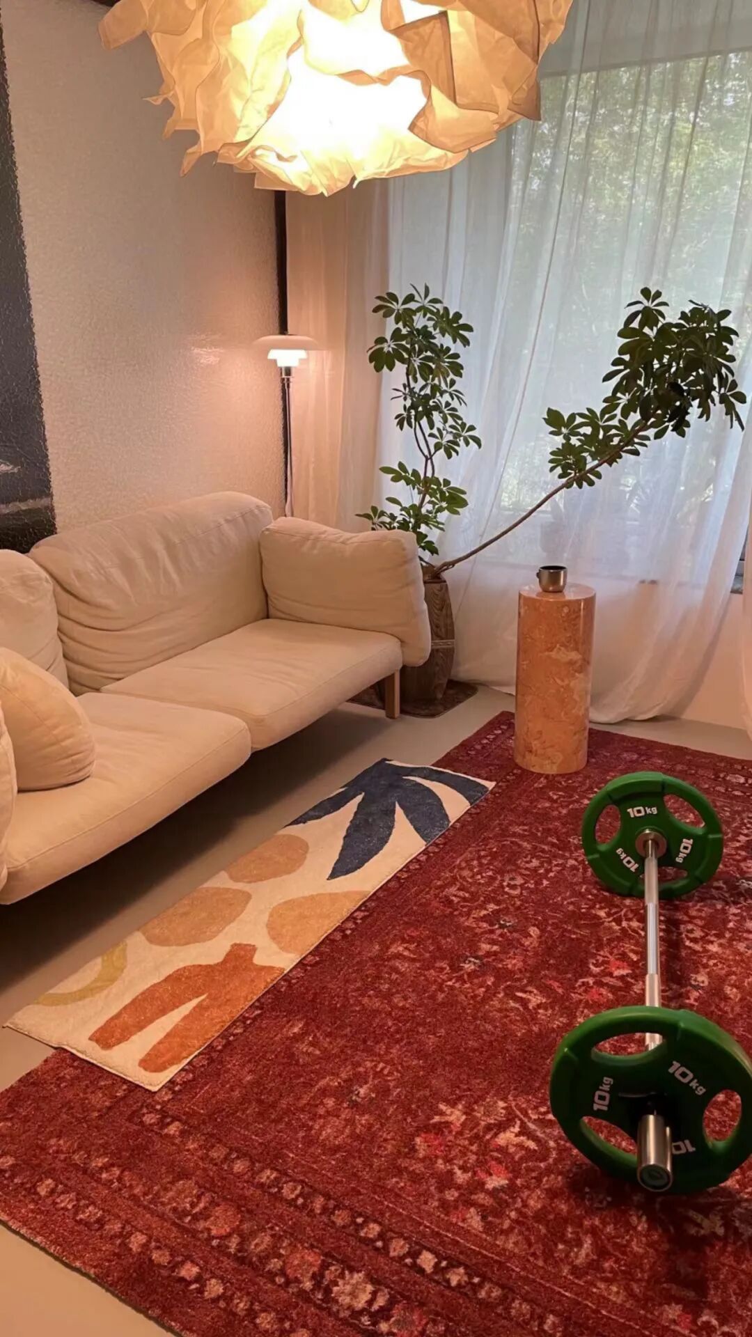 屋主后来换了新的地毯,也是红色!纸灯和亚麻窗帘也是营造氛围的利器了。