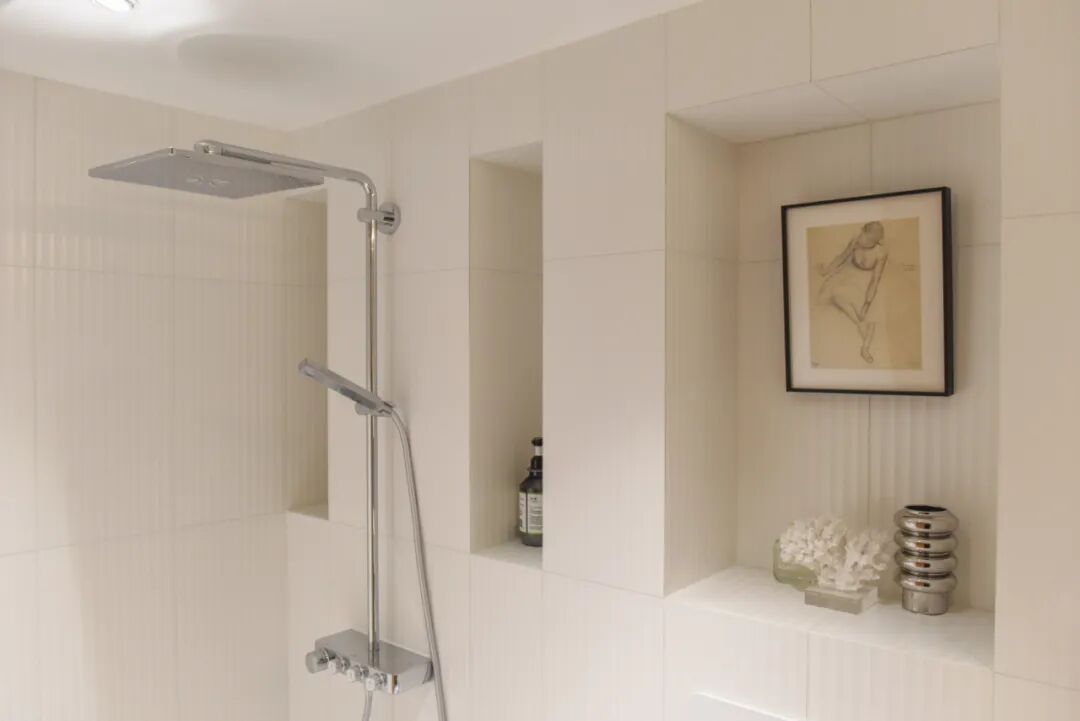 洗手台区域的墙面选择了哑光漆,而浴缸区的材料有一定反光度,光线不同二者之间的氛围也完全不同。