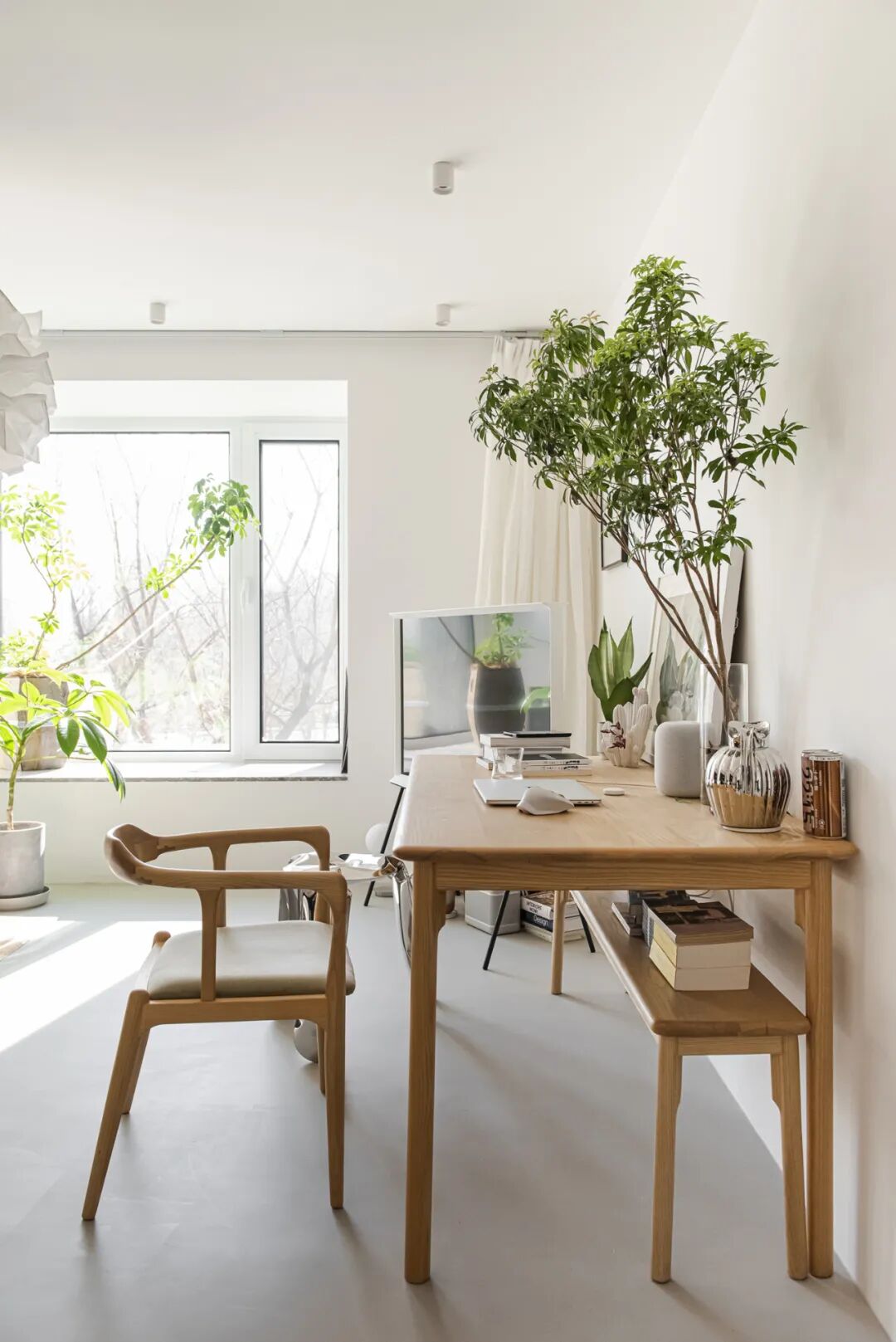 整个客厅都是充满氧气感的场域,我们没有死板的把所有物品都贴墙摆放,而是更集中一点,各自独立又互相包容。
