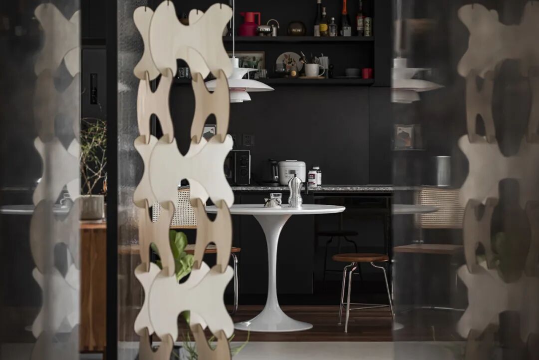K先生平时下厨的频次很低,加上一人食是生活里的常态,所以并没有单独规划出一个餐厅,而是在厨房旁边,利用原本储物间的位置,用家具营造了一个单人餐区。
