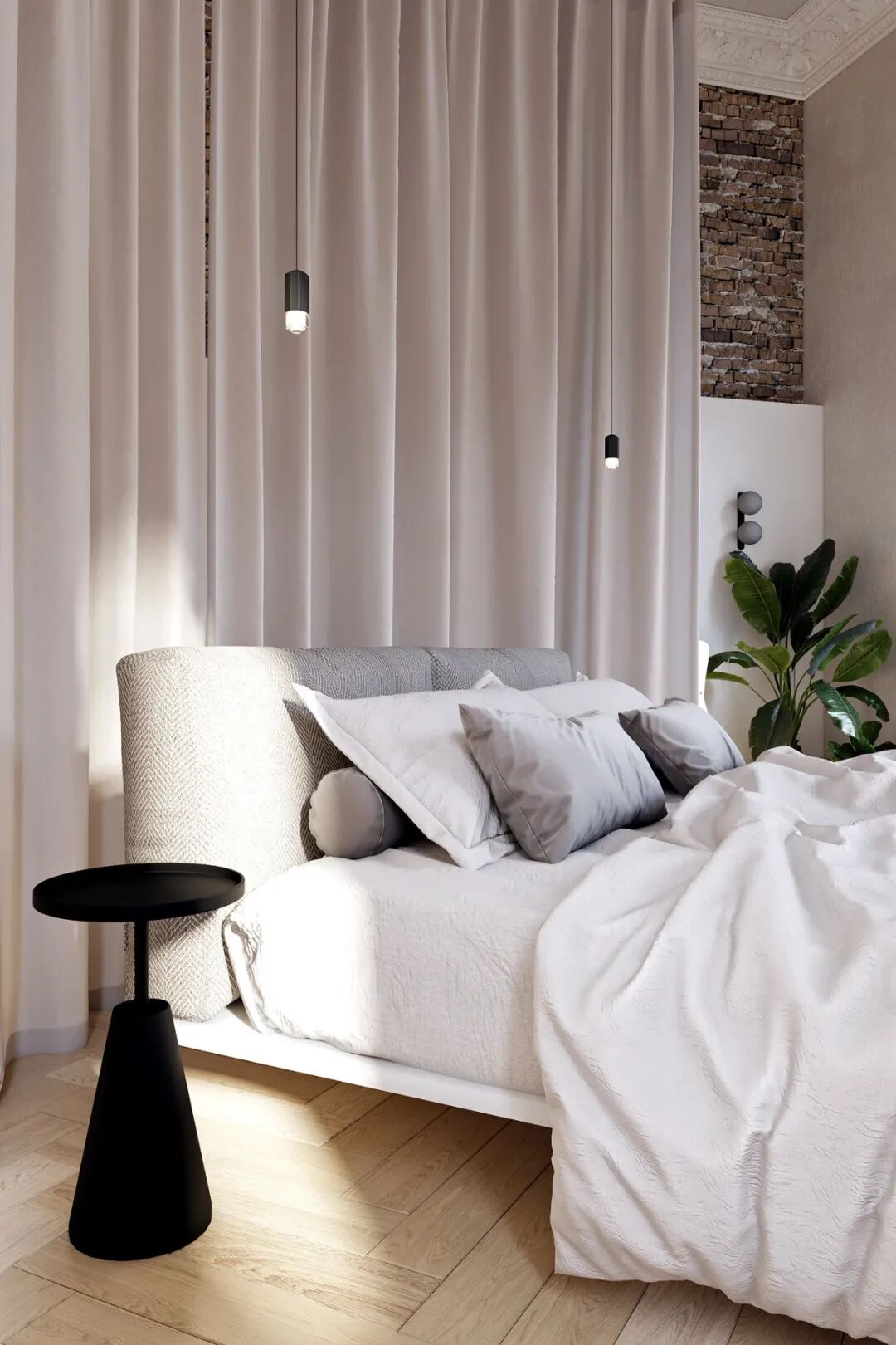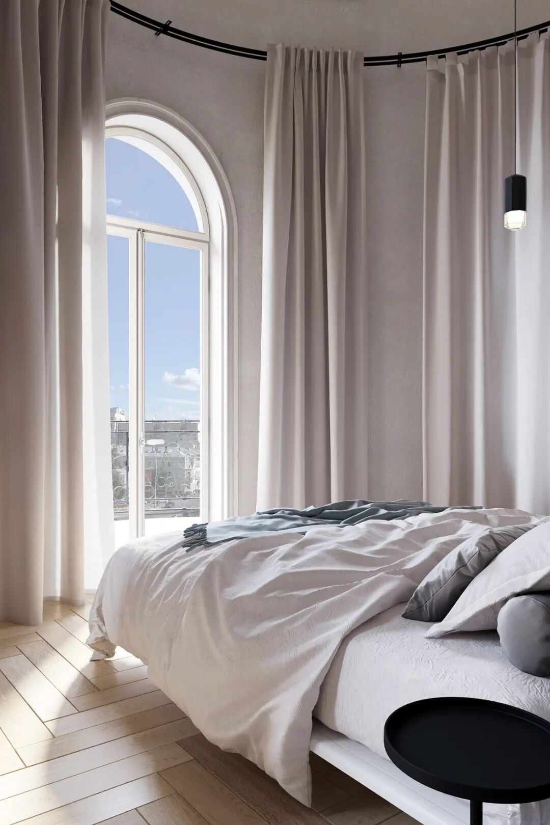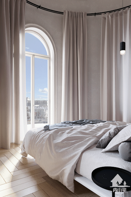 卧室正对着窗户,尽享户外的美丽景色,圆形的落地窗帘也保护了整体的私密性。