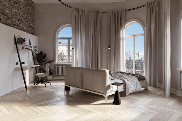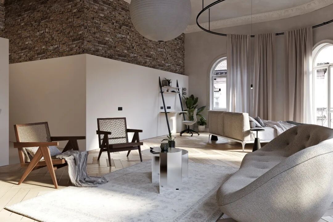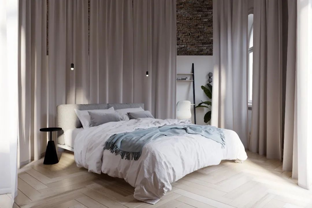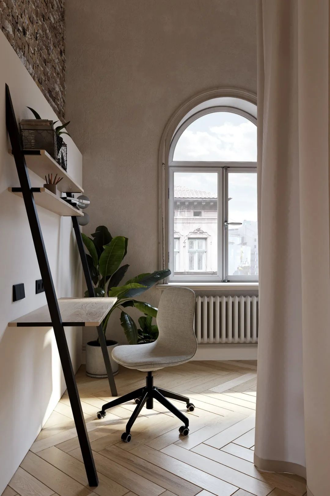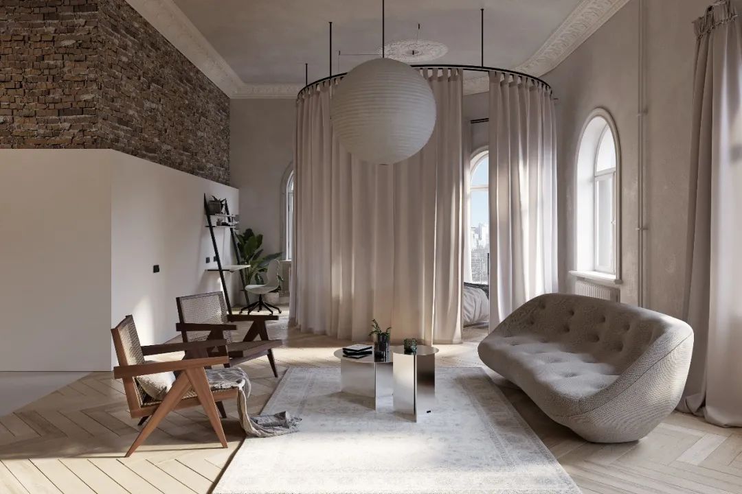 做旧的墙面与拱形的窗户,烘托出古典的氛围,浅色系的人字拼纹地板也十分优雅,面积的窗户提供了充足的采光。