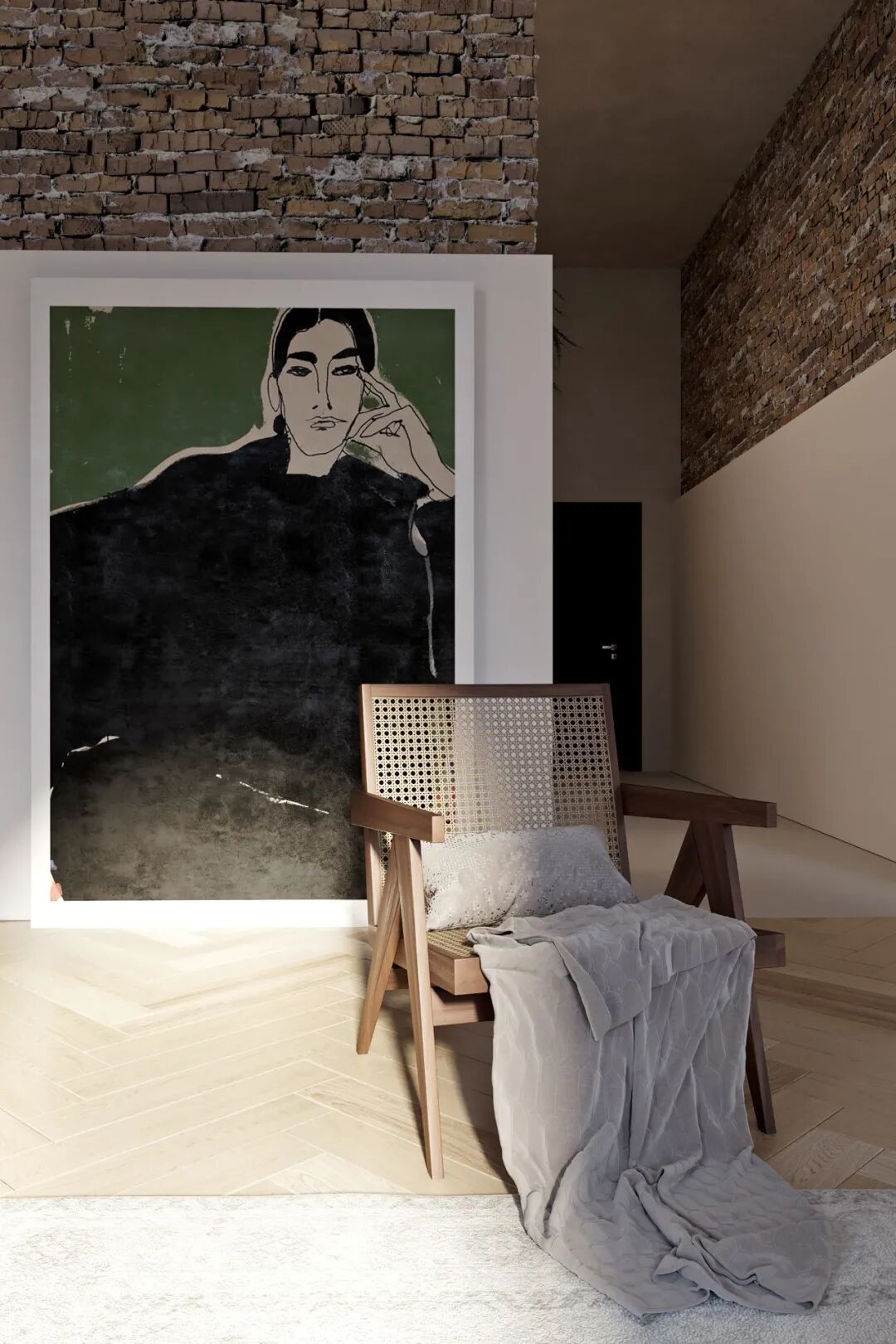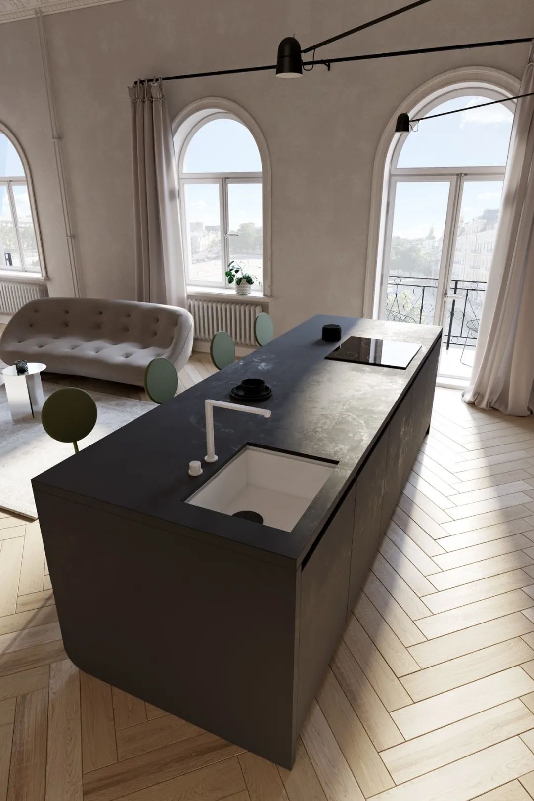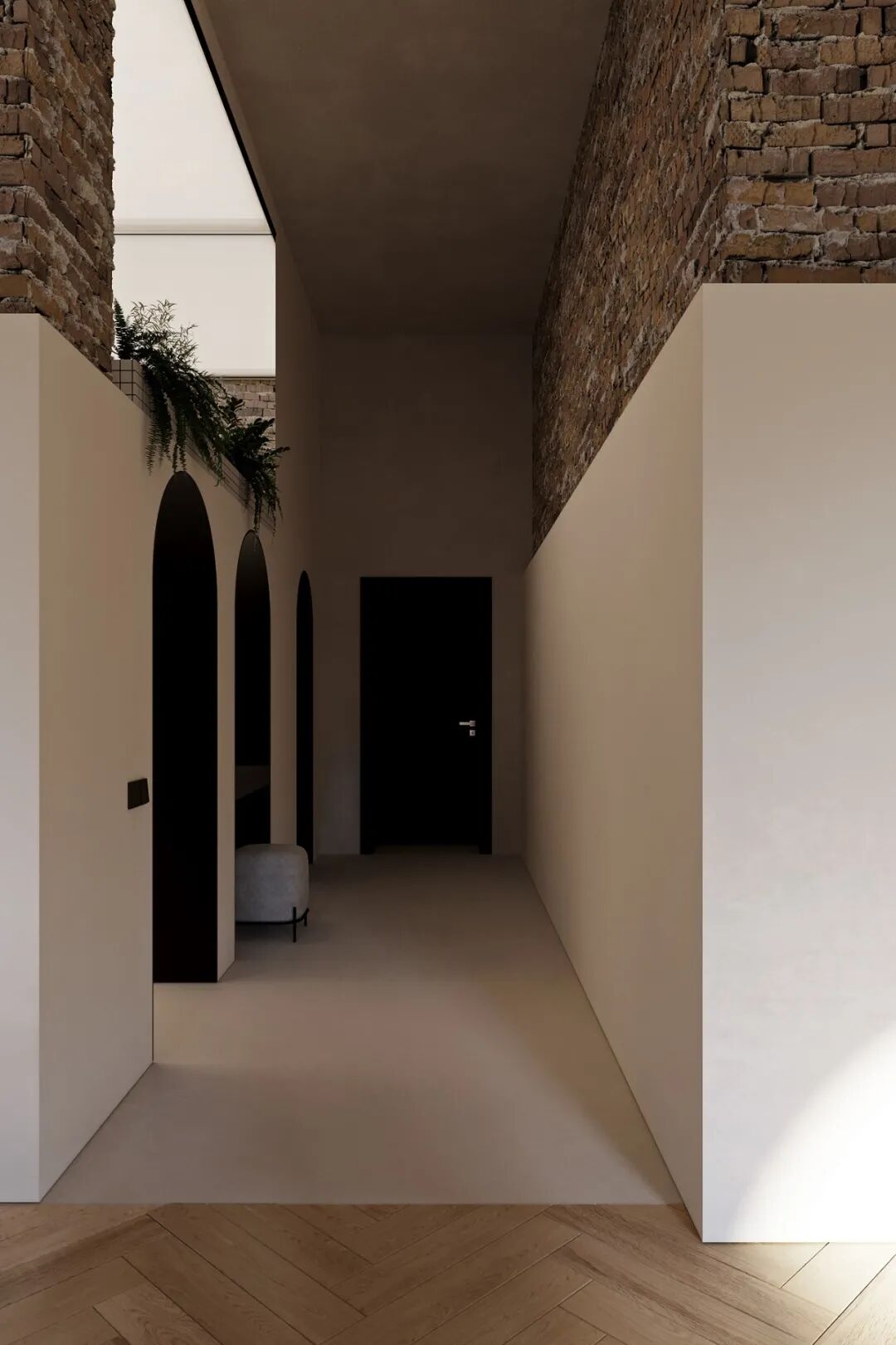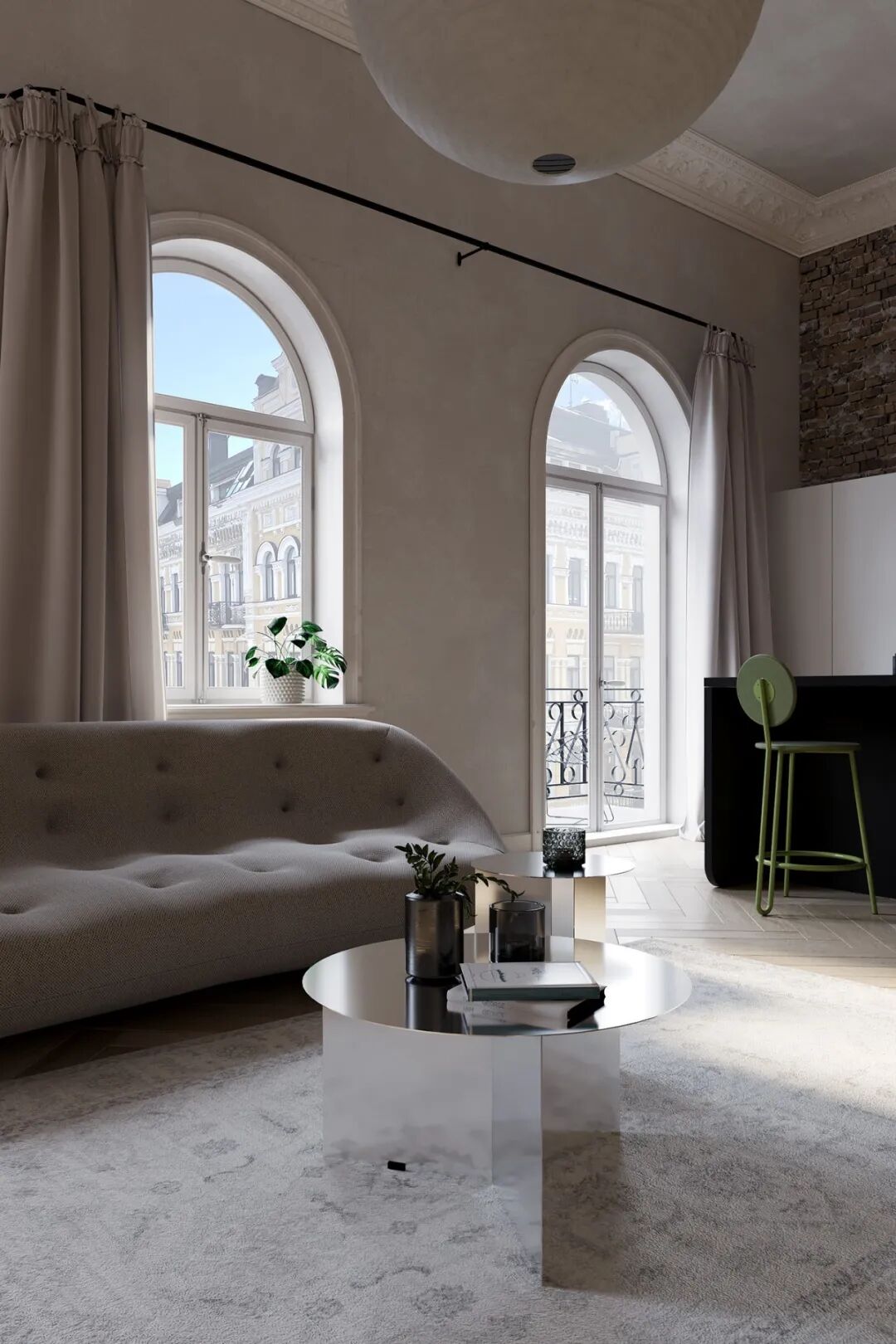 做旧的墙面与拱形的窗户,烘托出古典的氛围,浅色系的人字拼纹地板也十分优雅,面积的窗户提供了充足的采光。