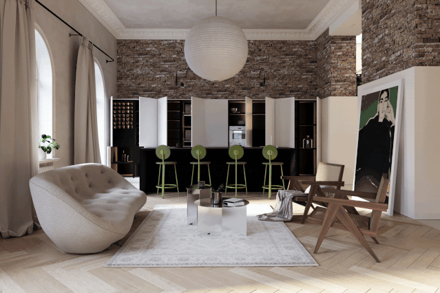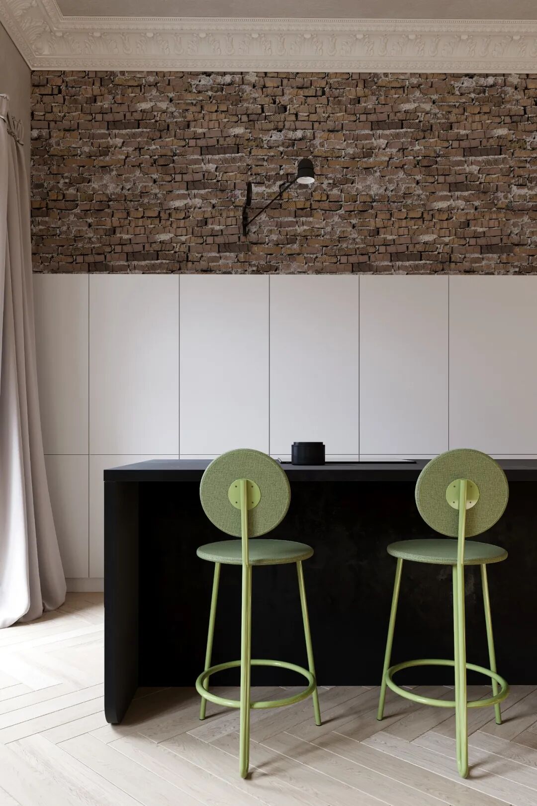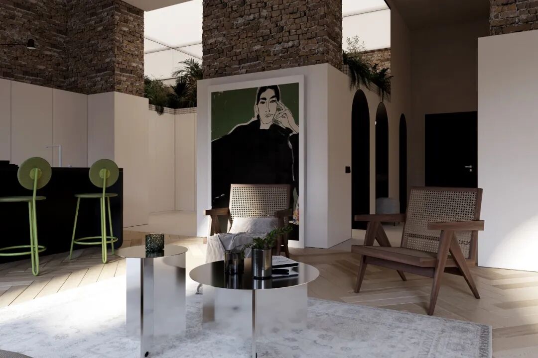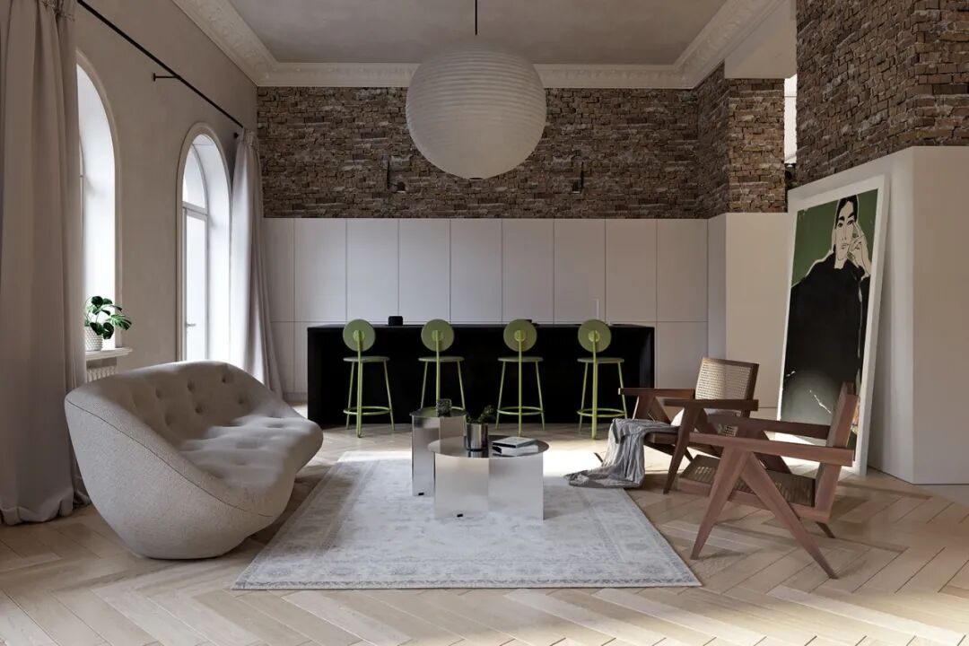 绿色的吧台椅颇有生机,也与一旁的巨幅挂画的色彩形成呼应,而上半部分保留的砖墙,与现代家具形成恰到好处的碰撞。